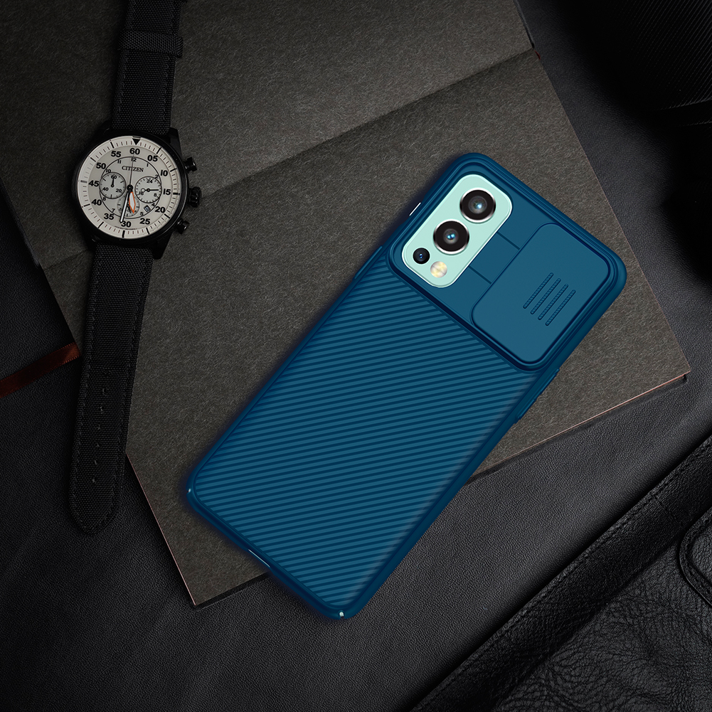 Противоударный чехол синего цвета с защитной крышкой задней камеры серии CamShield Case от Nillkin для телефона OnePlus Nord 2 5G с 2021 года, создан для любителей активного отдыха.