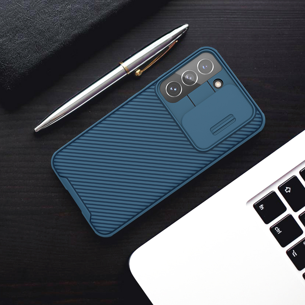 Противоударный чехол синего цвета с защитной шторкой задней камеры от Nillkin серии CamShield Pro Case для телефона Samsung Galaxy S22+ Плюс создан для любителей активного отдыха.
