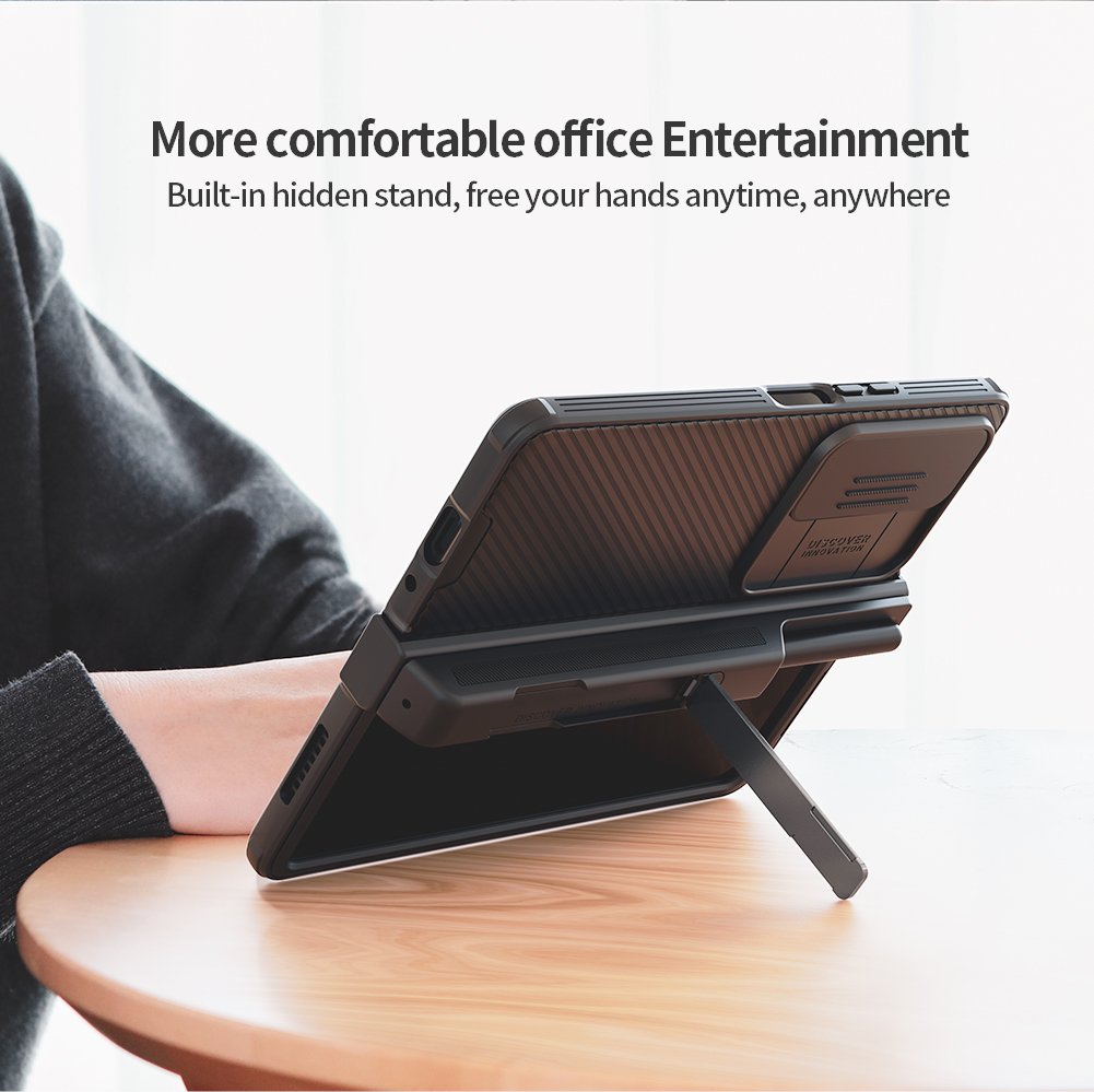 Противоударный чехол синего цвета с защитной шторкой задней камеры от Nillkin серии CamShield Pro Case для телефона Samsung Galaxy Z Fold 4 5G создан для любителей активного отдыха.