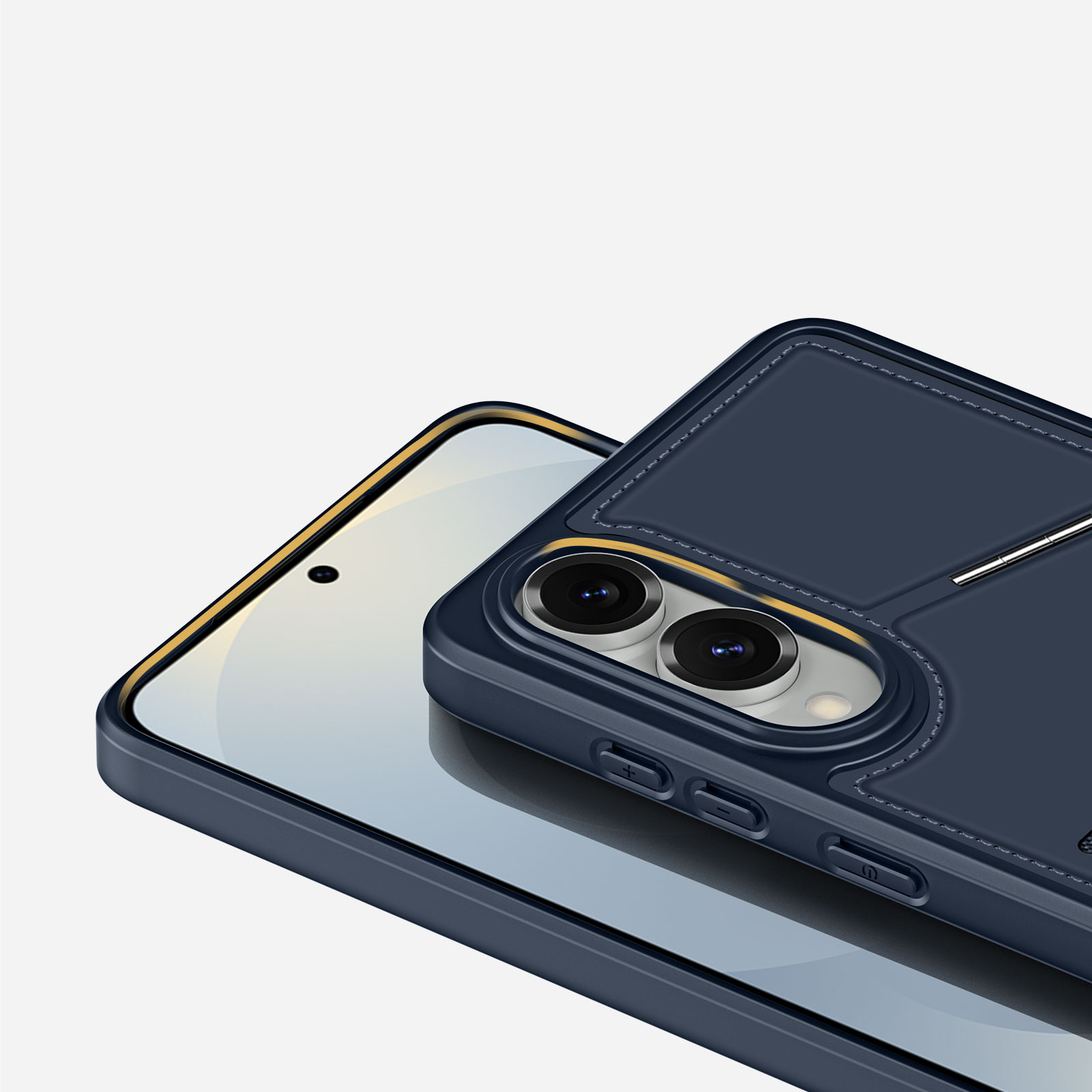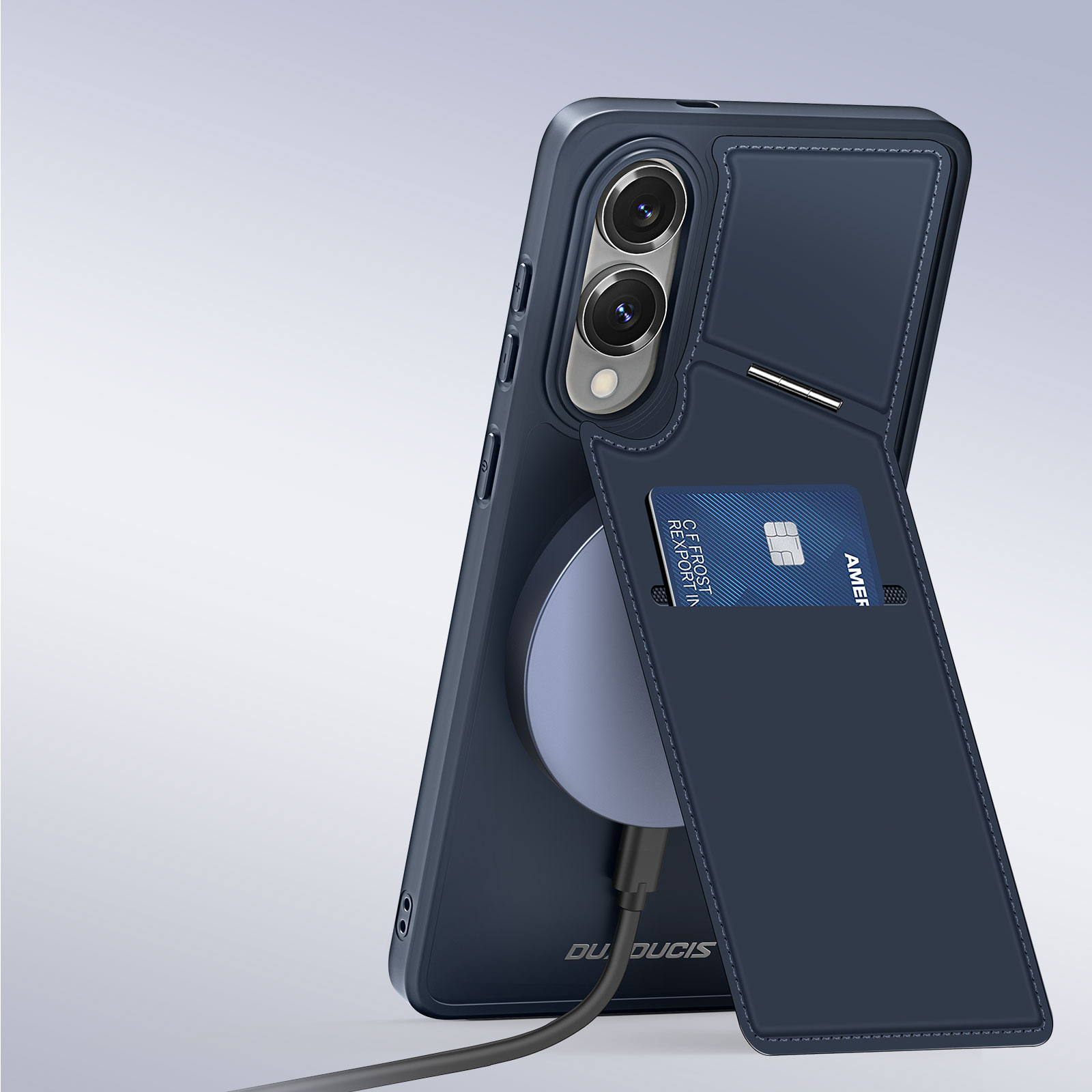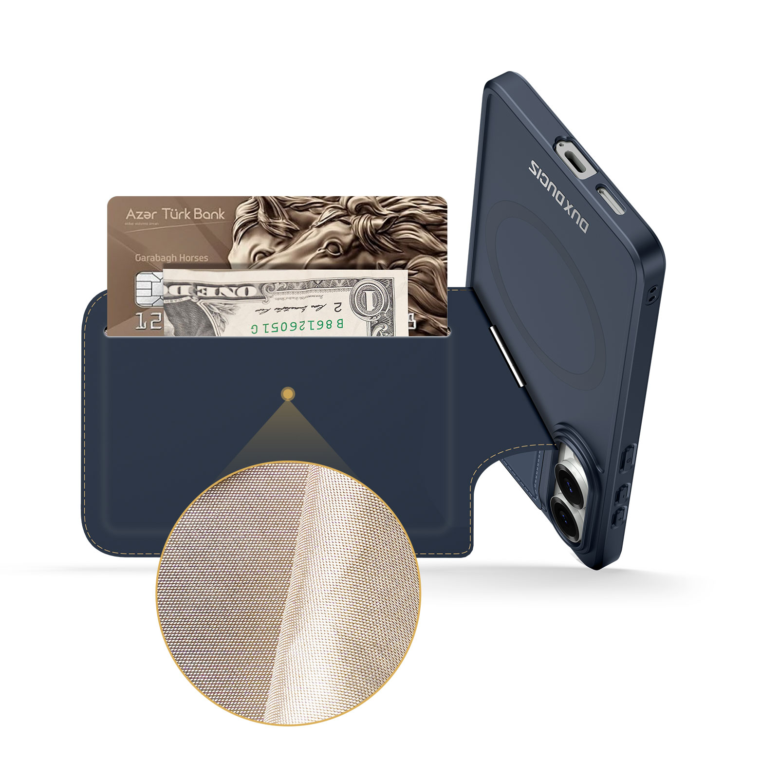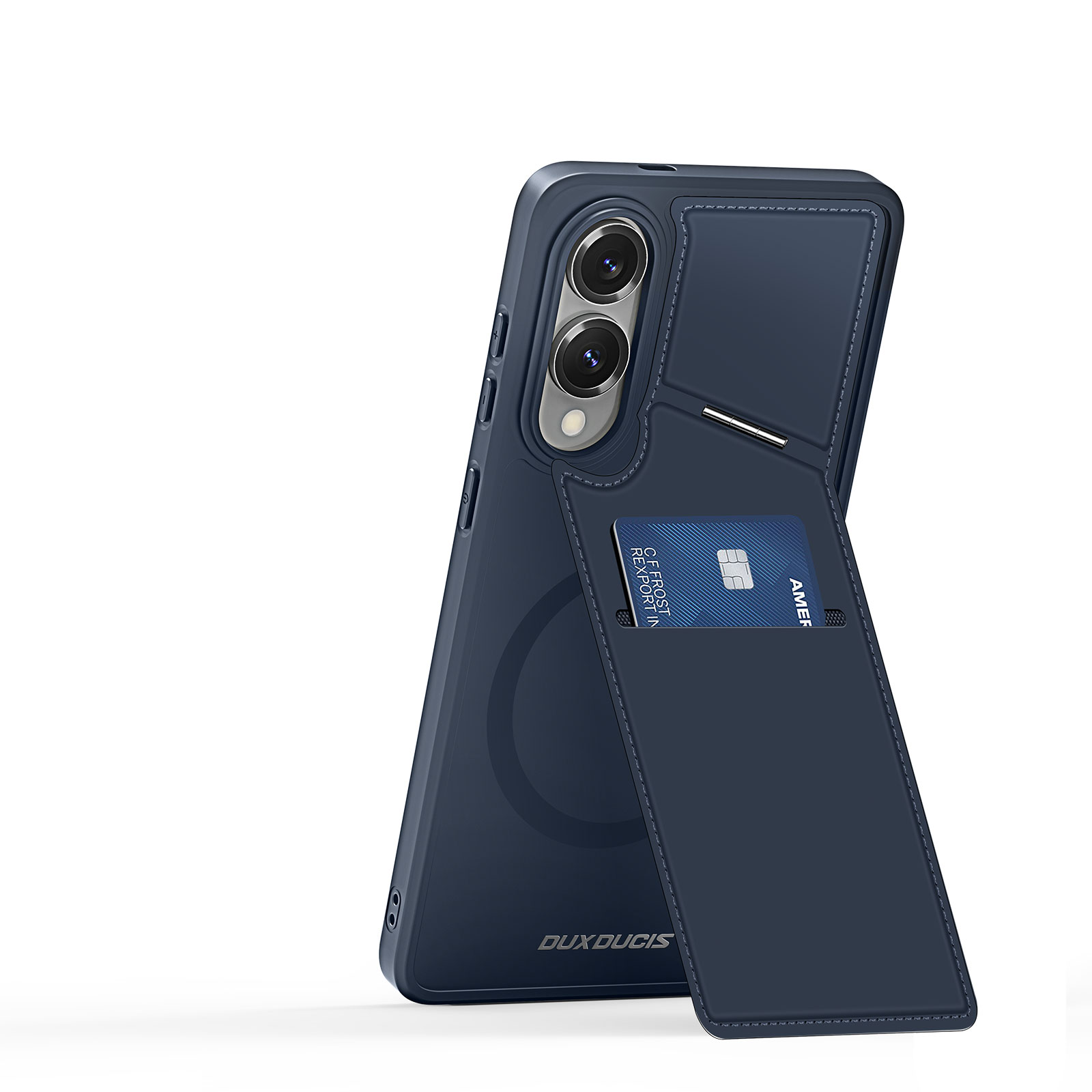 Чехол синего цвета с картхолдером и откидной подставкой от Dux Ducis для Samsung Galaxy S25 Edge, серия Rafi II Mag Series Case (версия с поддержкой MagSafe). Задняя часть этого чехла покрыта слоем гладкой кожи. Он имеет два держателя для карт, один снаружи и один внутри, внутренний имеет функцию защиты от кражи.