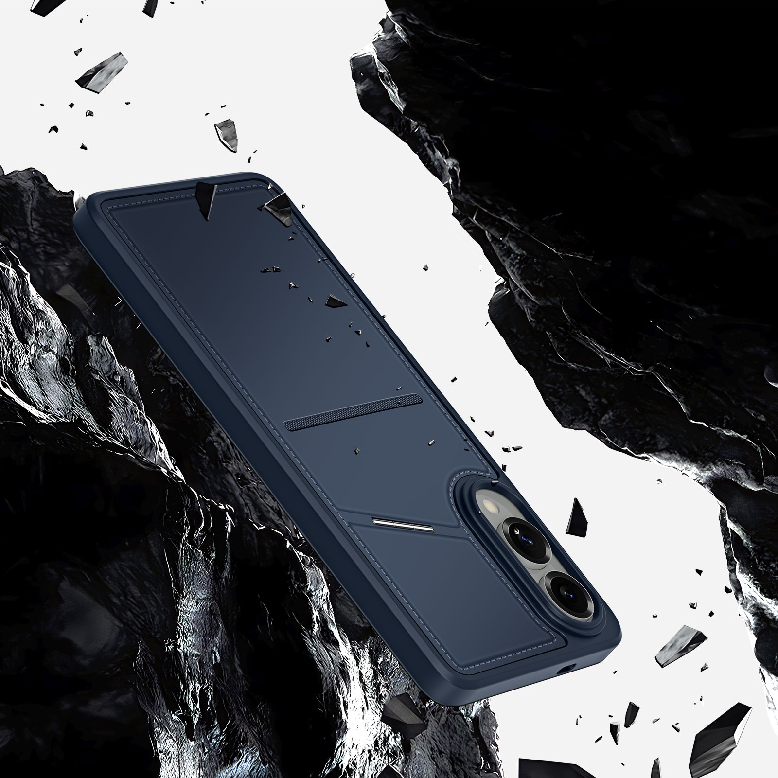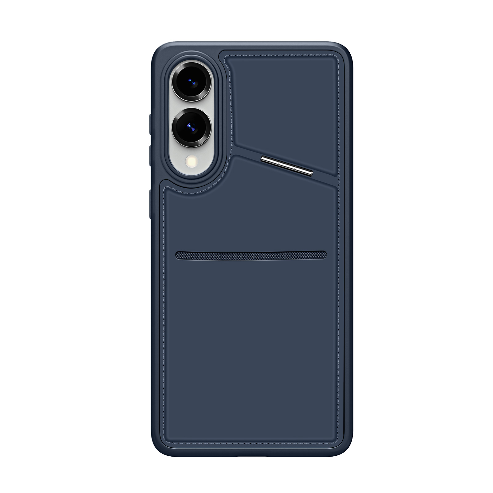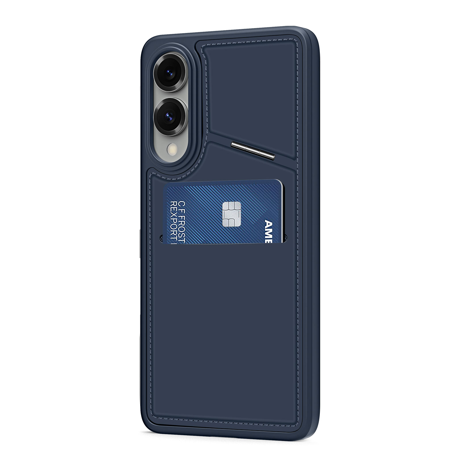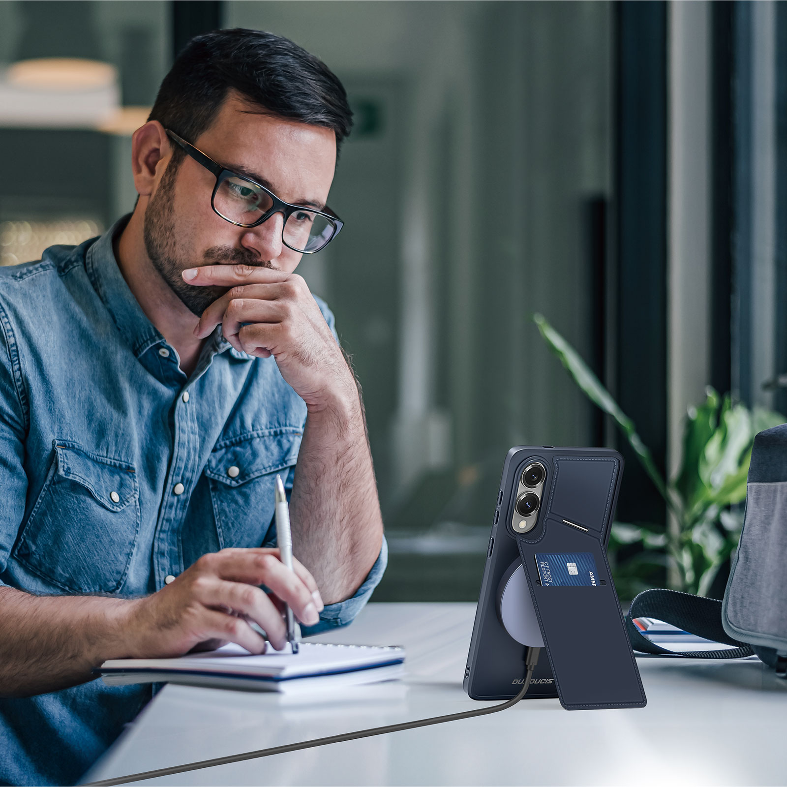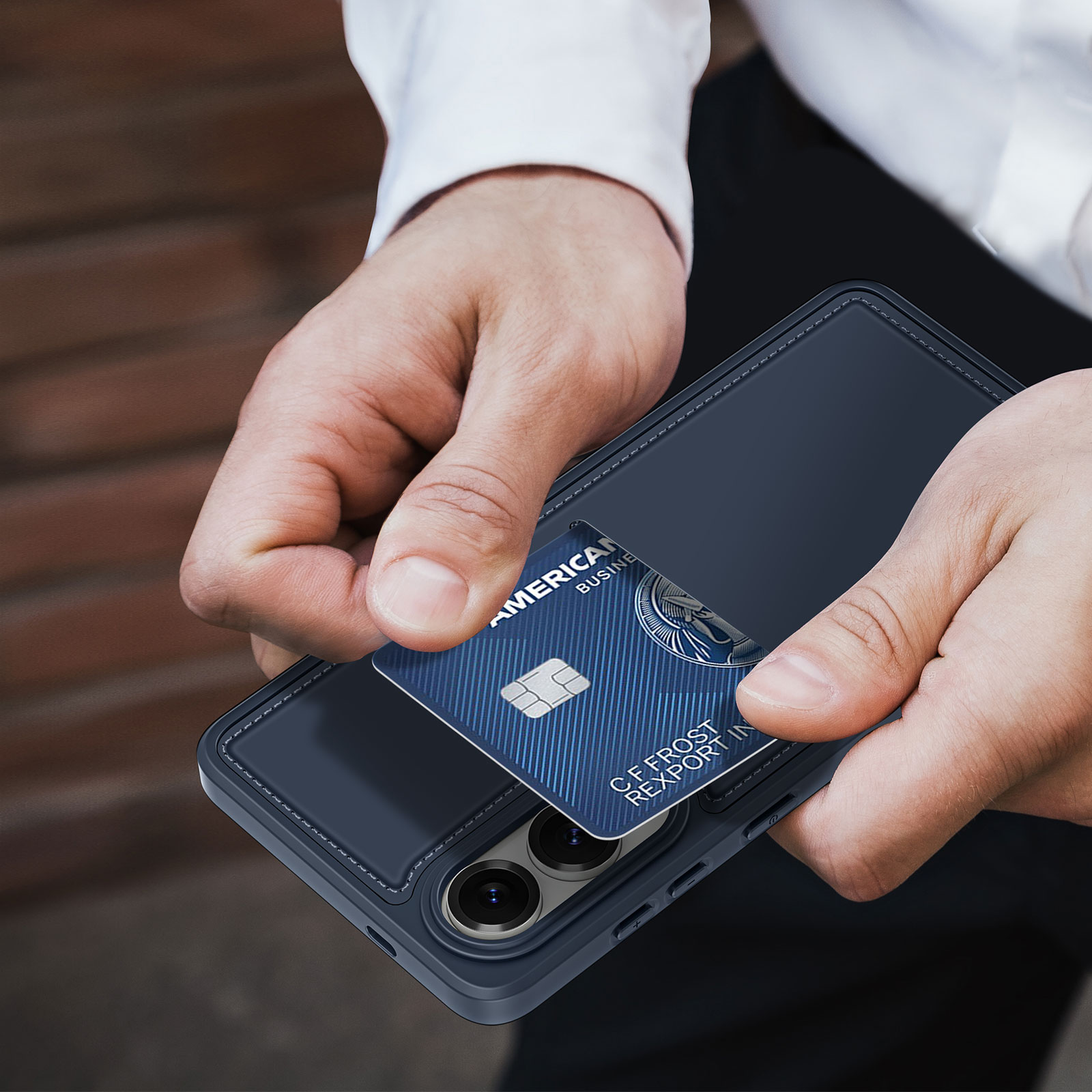 Чехол синего цвета с картхолдером и откидной подставкой от Dux Ducis для Samsung Galaxy S25 Edge, серия Rafi II Mag Series Case (версия с поддержкой MagSafe). Задняя часть этого чехла покрыта слоем гладкой кожи. Он имеет два держателя для карт, один снаружи и один внутри, внутренний имеет функцию защиты от кражи.