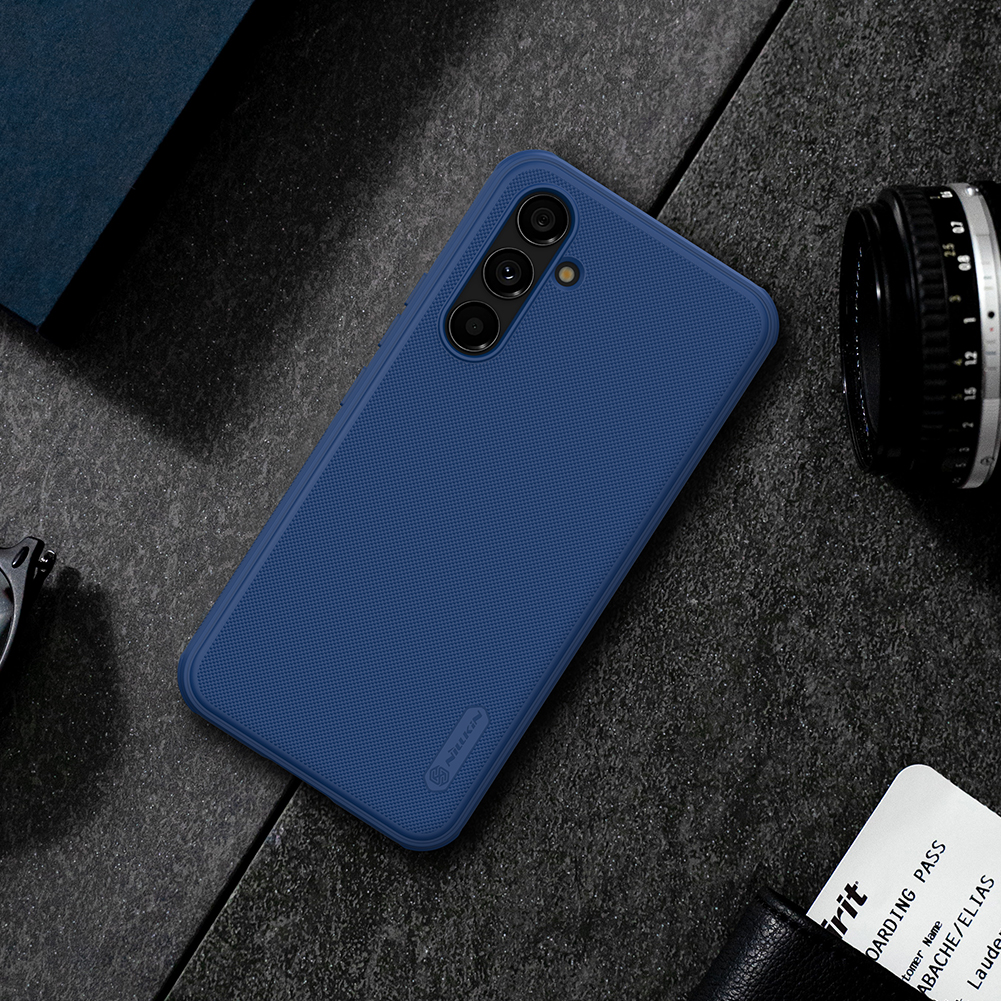 Защитный чехол синего цвета от Nillkin серии Super Frosted Shield для смартфона Samsung Galaxy A54 5G с усиленными боковыми рамками по четырем углам, изготавливается из экологичных материалов PC и TPU путем высокоточного литья под давление с высокой температурой.