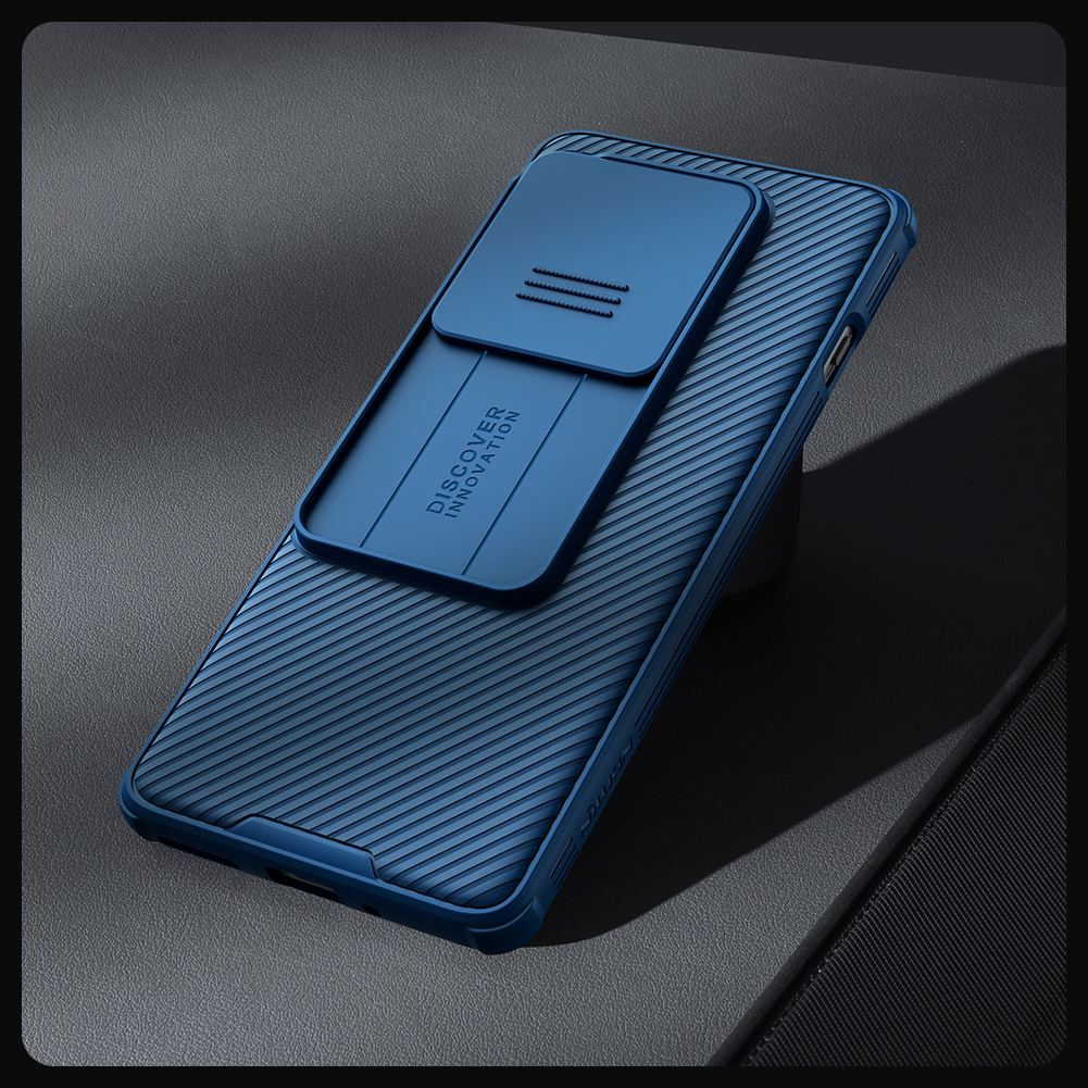 Противоударный чехол синего цвета с защитной шторкой задней камеры от Nillkin серии CamShield Pro Case для телефона OnePlus 12R и Ace 3 создан для любителей активного отдыха.