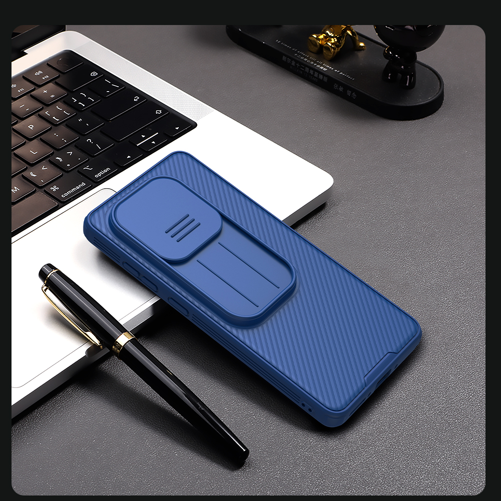 Противоударный чехол синего цвета с защитной шторкой задней камеры от Nillkin серии CamShield Pro Case для телефона OnePlus 13R, OnePlus Ace 5 и 5 Pro создан для любителей активного отдыха.