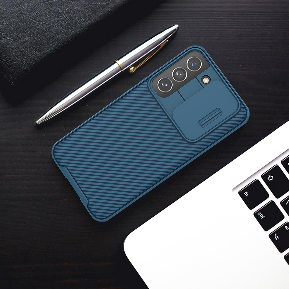 Противоударный чехол синего цвета с защитной шторкой задней камеры от Nillkin серии CamShield Pro Case для телефона Samsung Galaxy S22 создан для любителей активного отдыха.