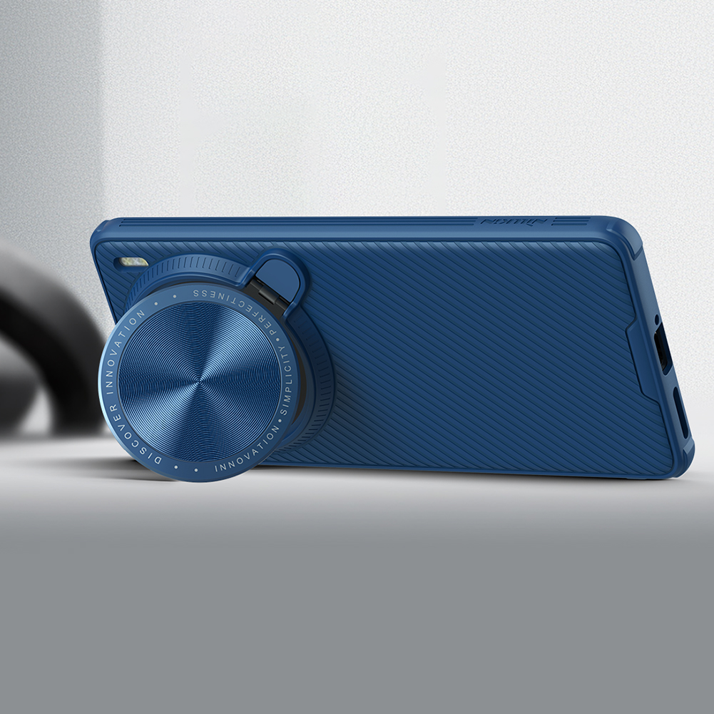 Противоударный чехол синего цвета с откидной металлической защитной крышкой для камеры от Nillkin серии CamShield Prop Case для телефона Vivo X100 Pro создан для любителей активного отдыха.