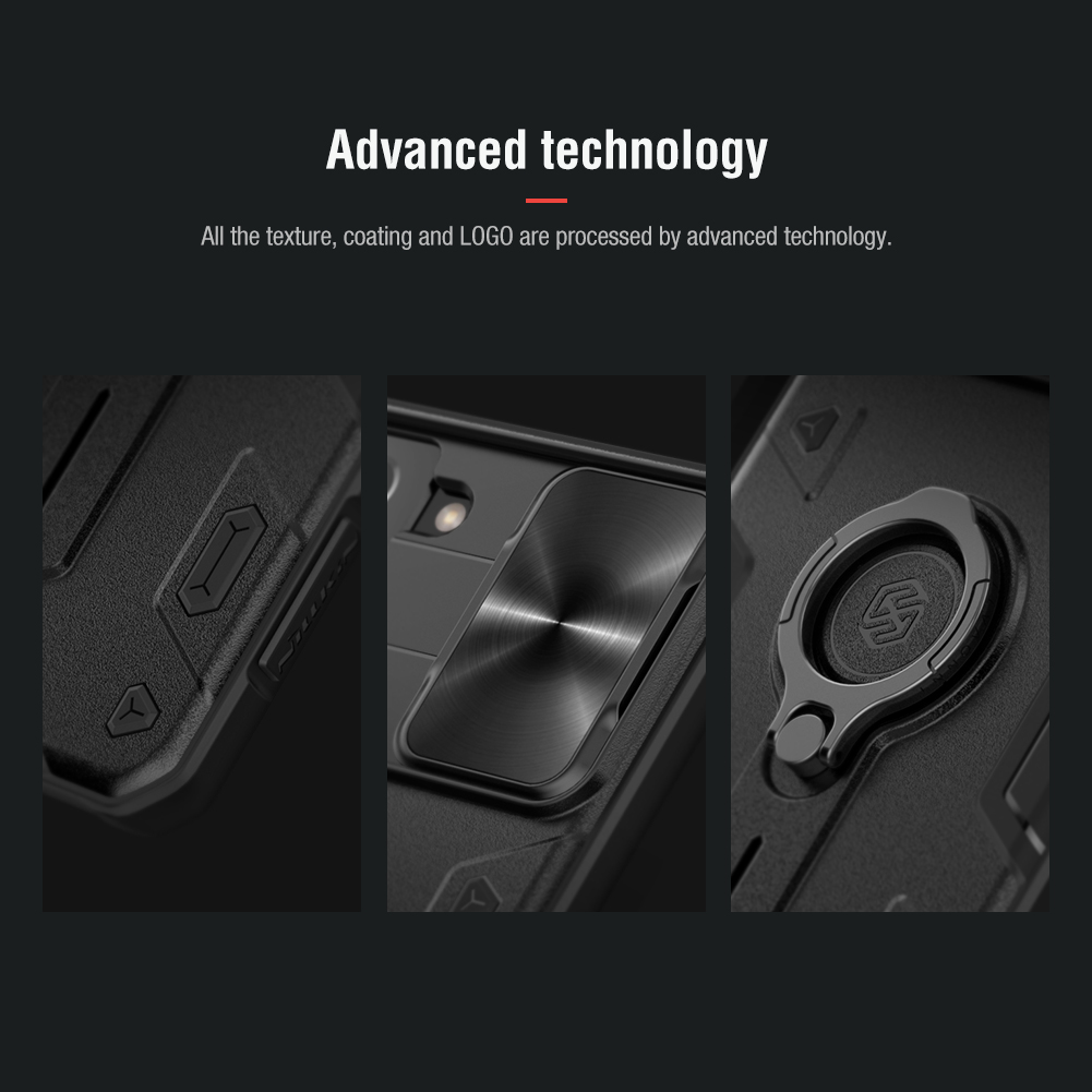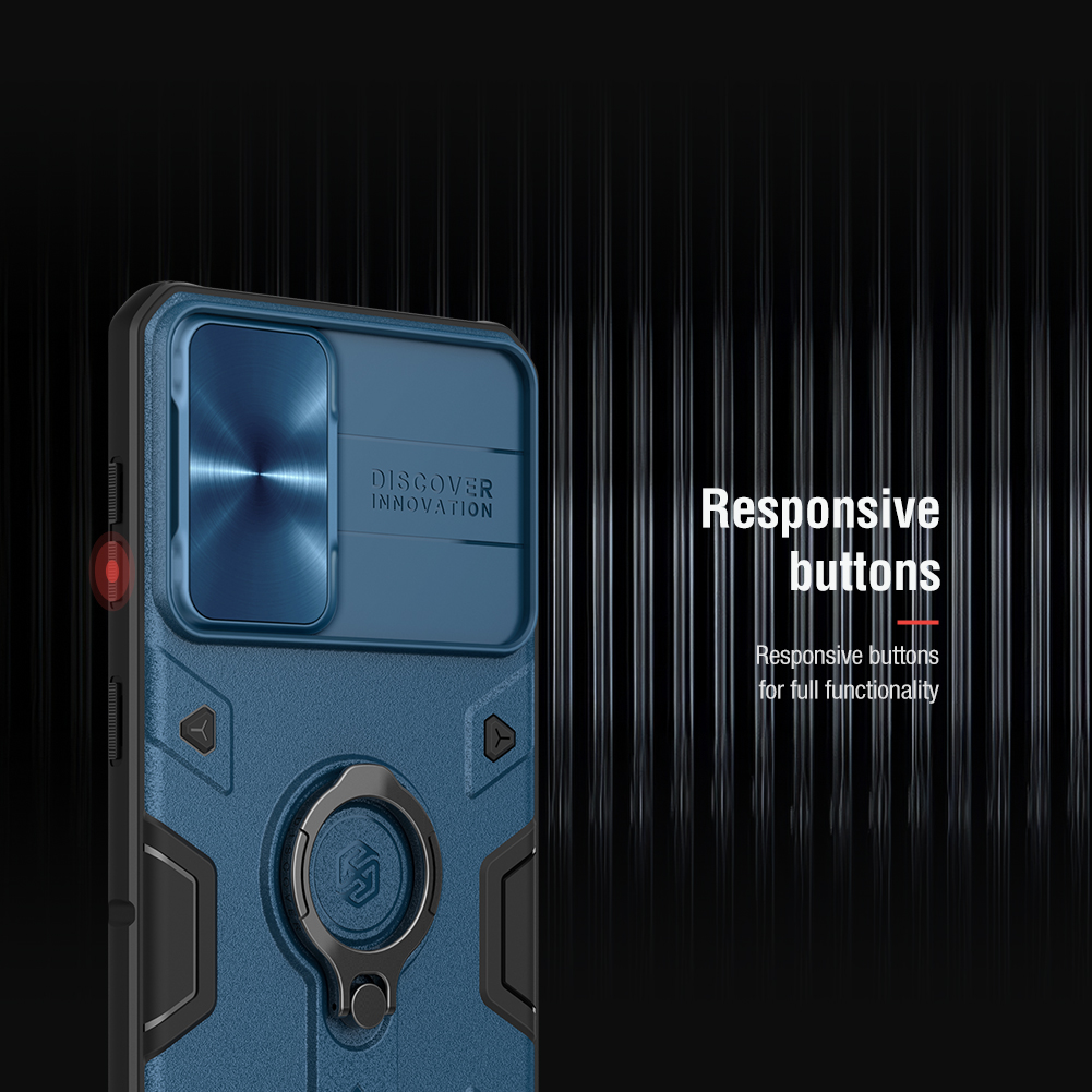 Противоударный чехол синего цвета с кольцом и защитной крышкой для задней камеры от Nillkin серии CamShield Armor Case для смартфона Samsung Galaxy S21+ Плюс создан для любителей активного отдыха.