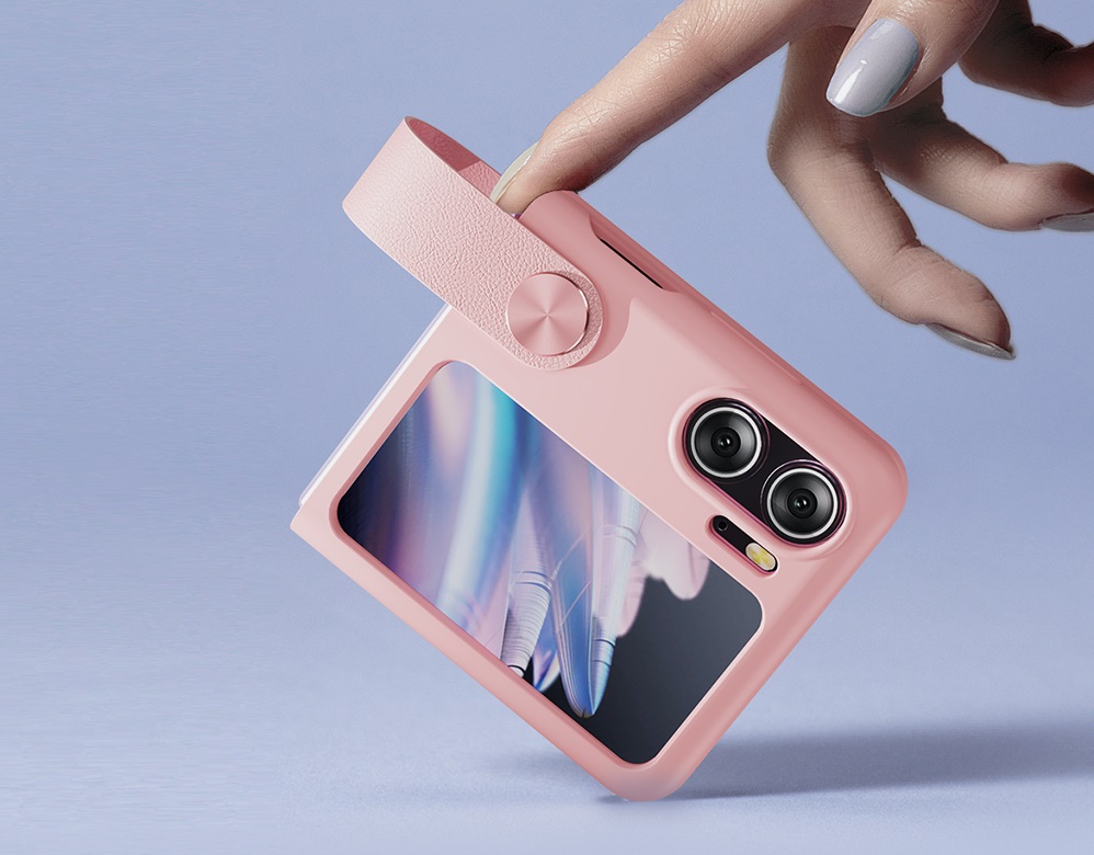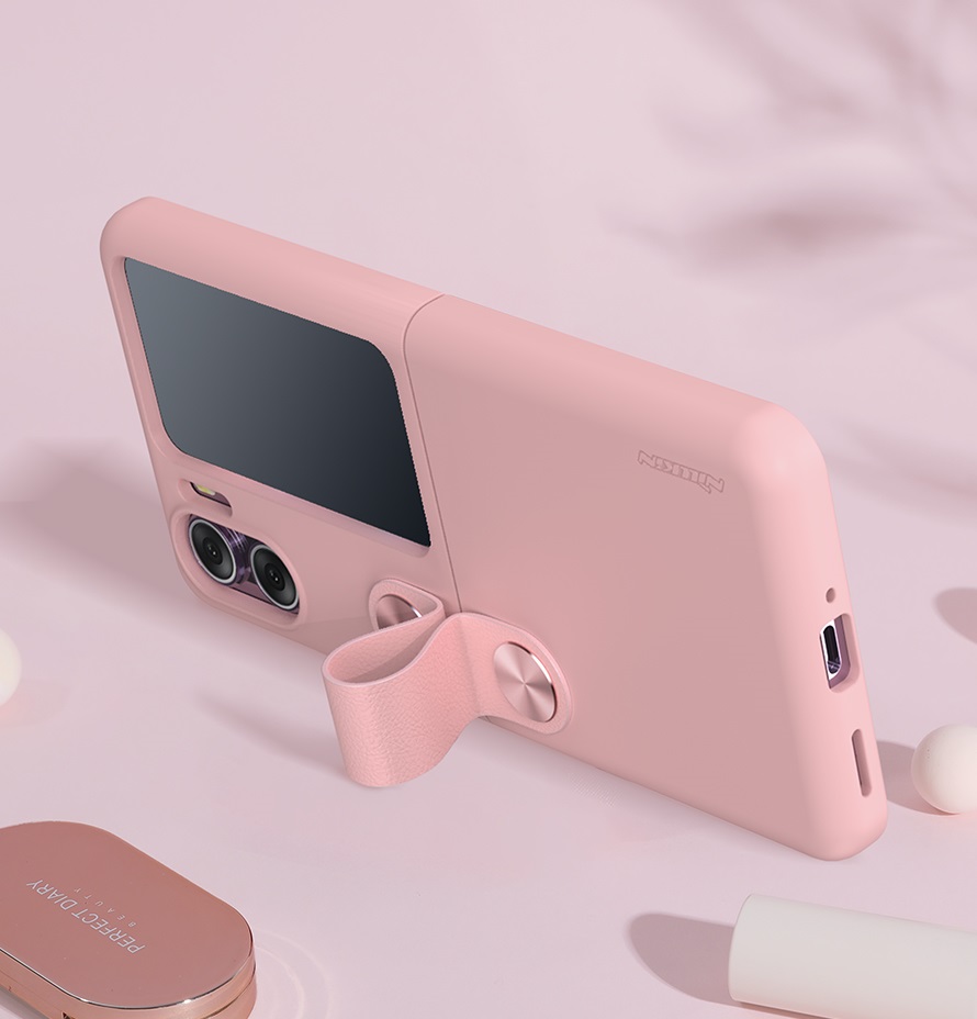 Противоскользящий чехол светло-персикового цвета (Light Peach) из шелковистого силикона от Nillkin серии Flex Flip для телефона OPPO Find N2 Flip.