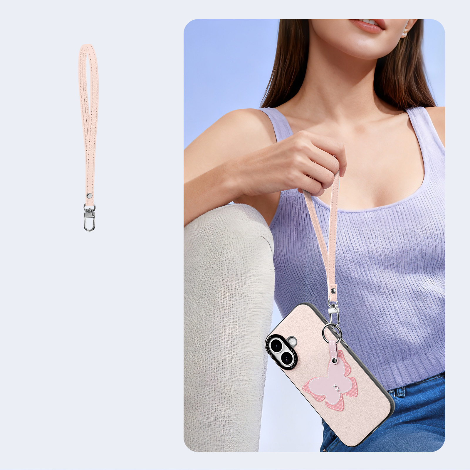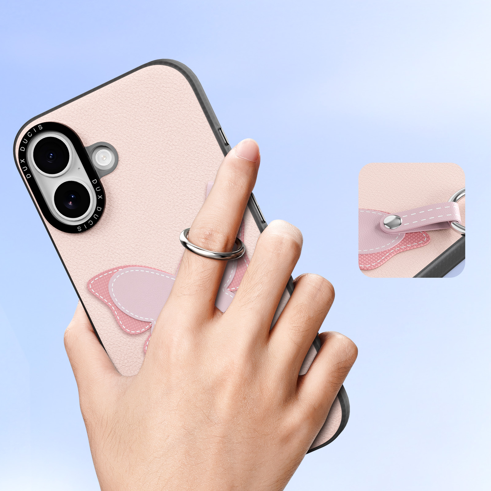 Чехол из искусственной кожи светло-розового цвета (Butterfly Edition) серии Luvy для iPhone 17. Встроенное вращающееся кольцо - надёжный захват одной рукой, предотвращающий падение; в комплект входит ремешок с защитой от потери.