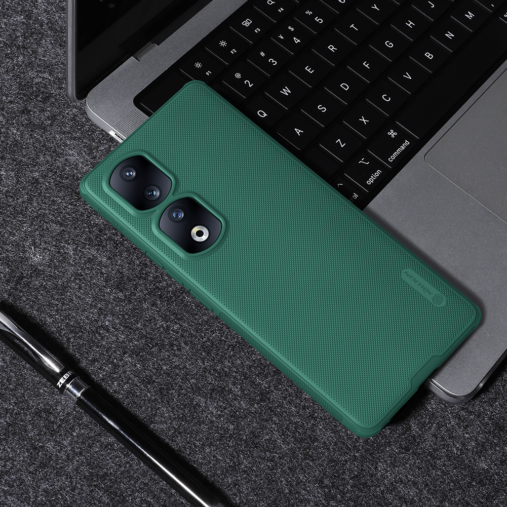Защитный чехол темно-зеленого цвета (Deep Green) от Nillkin серии Super Frosted Shield Pro Magnetic для смартфона Huawei Honor 90 Pro с усиленными боковыми рамками по четырем углам и встроенным магнитом, изготавливается из экологичных материалов PC и TPU путем высокоточного литья под давление с высокой температурой.