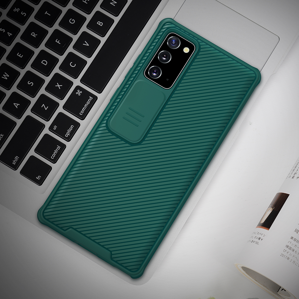 Противоударный чехол темно-зеленого цвета (Deep Green) с защитной крышкой задней камеры от Nillkin серии CamShield Pro Case для Samsung Galaxy Note 20 создан для любителей активного отдыха.