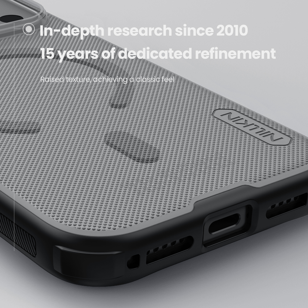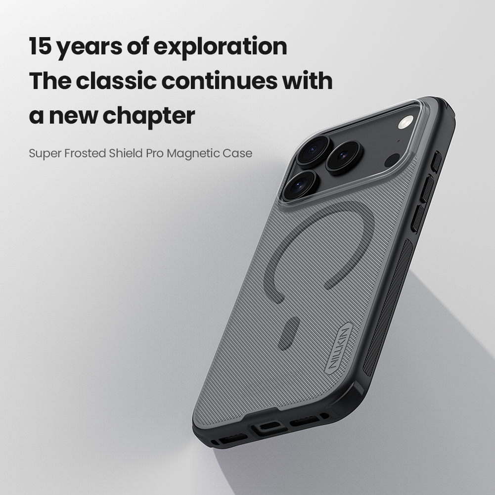 Защитный чехол прозрачный тонированный (Transparent black) от Nillkin серии Super Frosted Shield Pro Magnetic (Clear version) для смартфона iPhone 17 Pro с усиленными боковыми рамками по четырем углам и поддержкой зарядки MagSafe, изготавливается из экологичных материалов PC и TPU путем высокоточного литья под давление с высокой температурой.
