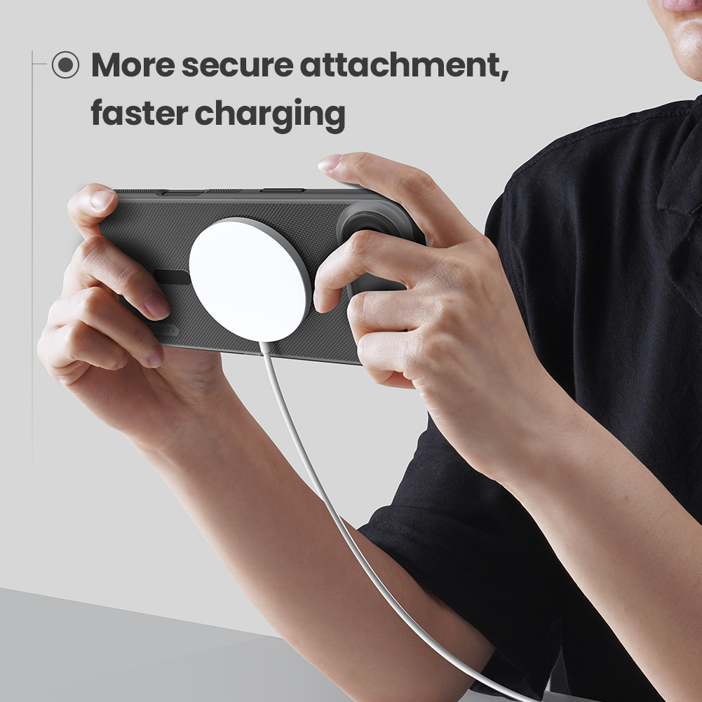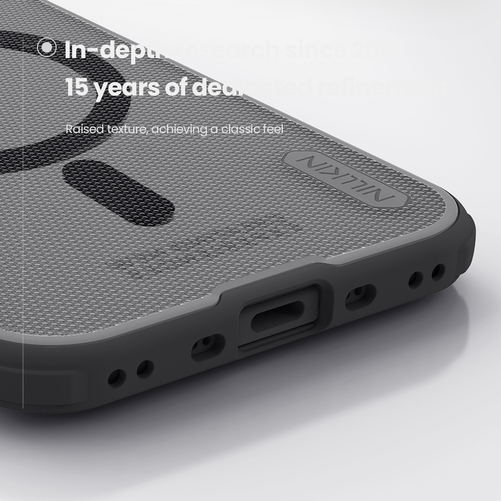 Защитный чехол прозрачный тонированный (Transparent black) от Nillkin серии Super Frosted Shield Pro Magnetic (Clear version) для смартфона iPhone Air с усиленными боковыми рамками по четырем углам и поддержкой зарядки MagSafe, изготавливается из экологичных материалов PC и TPU путем высокоточного литья под давление с высокой температурой.