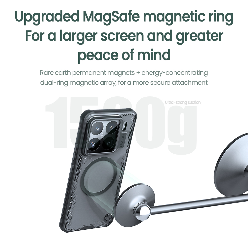 Противоударный чехол тонированный прозрачный с металлической откидной крышкой и поддержкой магнитной беспроводной зарядки MagSafe от Nillkin серии Iceblade Prop Magnetic (Camera-visible Version) (версия с открытой камерой) для телефона Xiaomi 15 Pro создан для любителей активного отдыха.