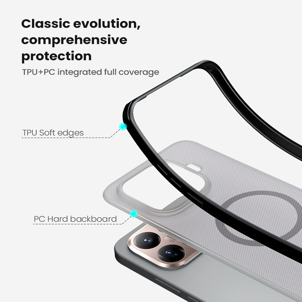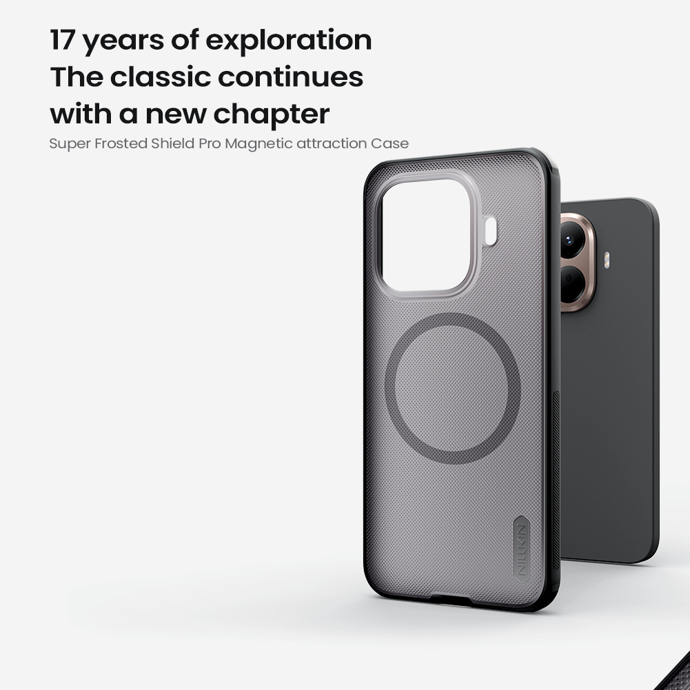 Защитный чехол тонированный прозрачный (Transparent black) от Nillkin серии Super Frosted Shield Pro Magnetic (для держателя и зарядки необходимо использовать индукционный магнит MagSafe) на смартфон Xiaomi 15T Pro с усиленными боковыми рамками по четырем углам, изготавливается из экологичных материалов PC и TPU путем высокоточного литья под давление с высокой температурой.