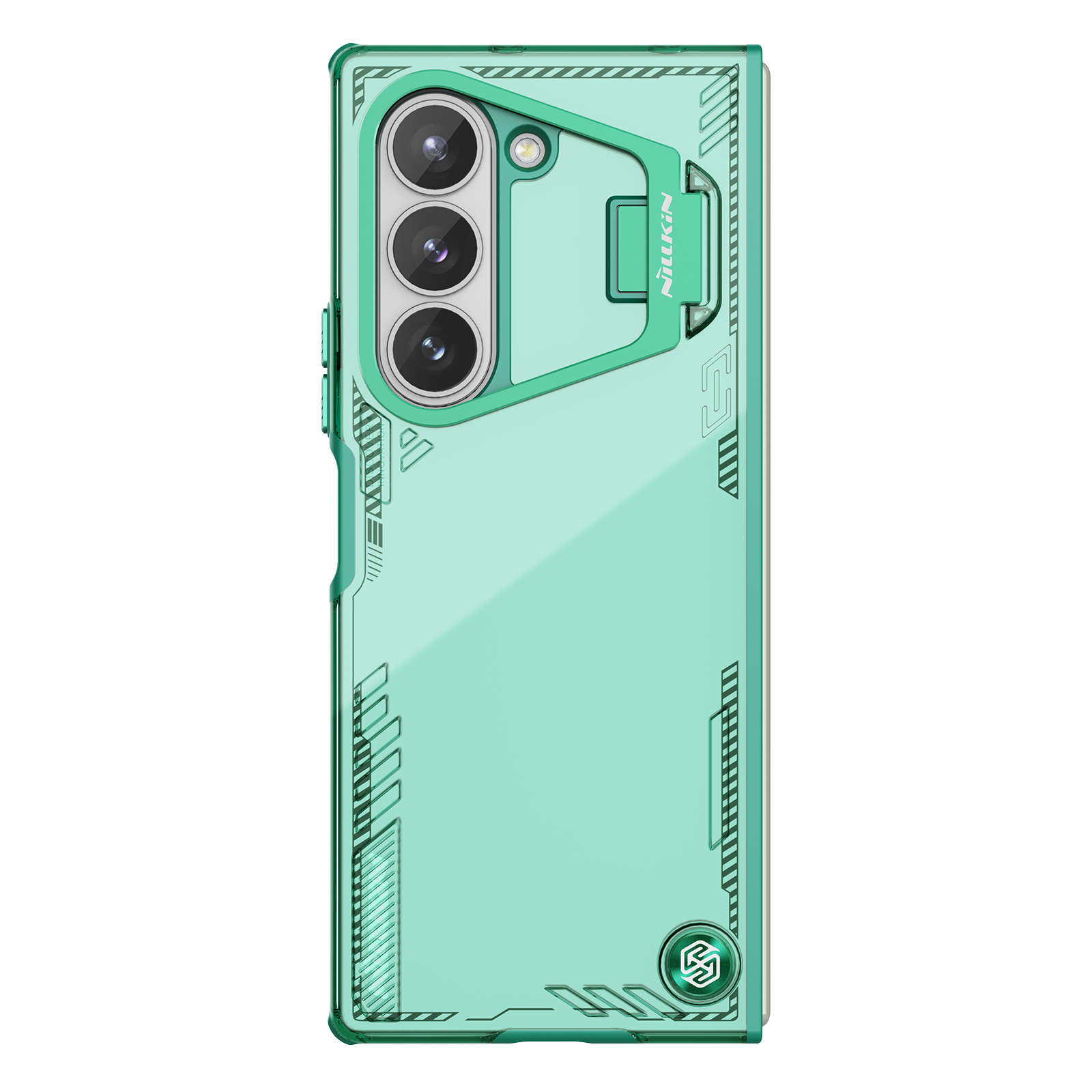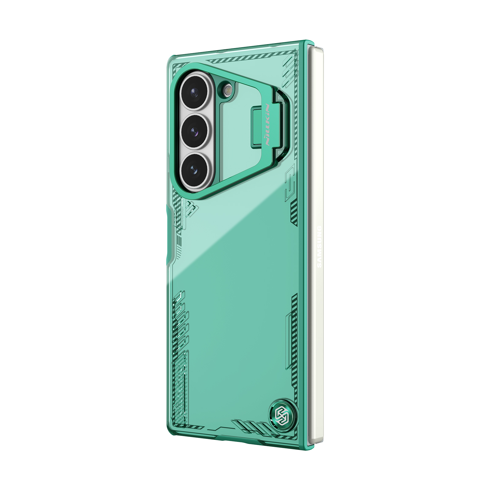 Противоударный чехол тонированный зеленого цвета с металлической откидной крышкой от Nillkin серии Iceblade Fold Case для телефона Samsung Galaxy Z Fold 6 5G создан для любителей активного отдыха.
