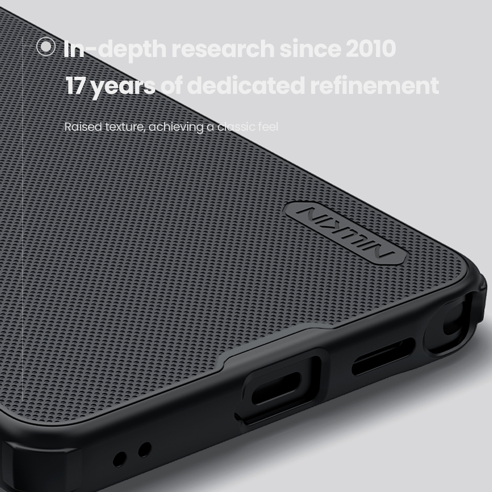 Защитный чехол черного цвета от Nillkin серии Super Frosted Shield Pro для смартфона Samsung Galaxy S26 Ultra с усиленными боковыми рамками по четырем углам, изготавливается из экологичных материалов PC и TPU путем высокоточного литья под давление с высокой температурой.