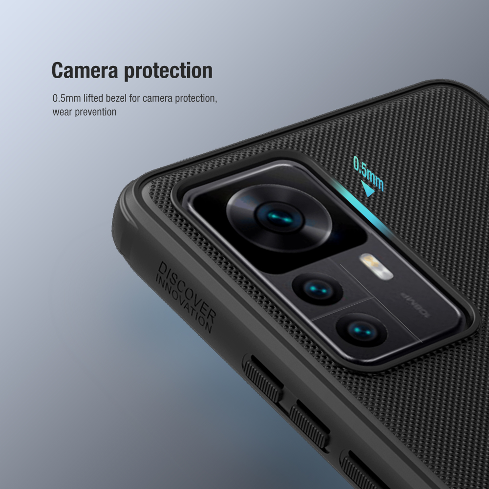 Тонкий защитный чехол черного цвета от Nillkin серии Super Frosted Shield для смартфона Xiaomi 12T с усиленными боковыми рамками по четырем углам, изготавливается из экологичных материалов PC и TPU путем высокоточного литья под давление с высокой температурой.