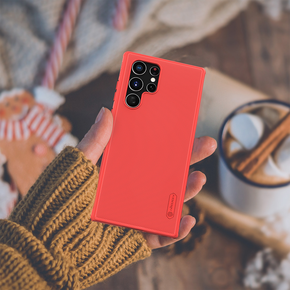Тонкий защитный чехол красного цвета от Nillkin серии Super Frosted Shield для смартфона Samsung Galaxy S22 Ultra с усиленными боковыми рамками по четырем углам, изготавливается из экологичных материалов PC и TPU путем высокоточного литья под давление с высокой температурой.