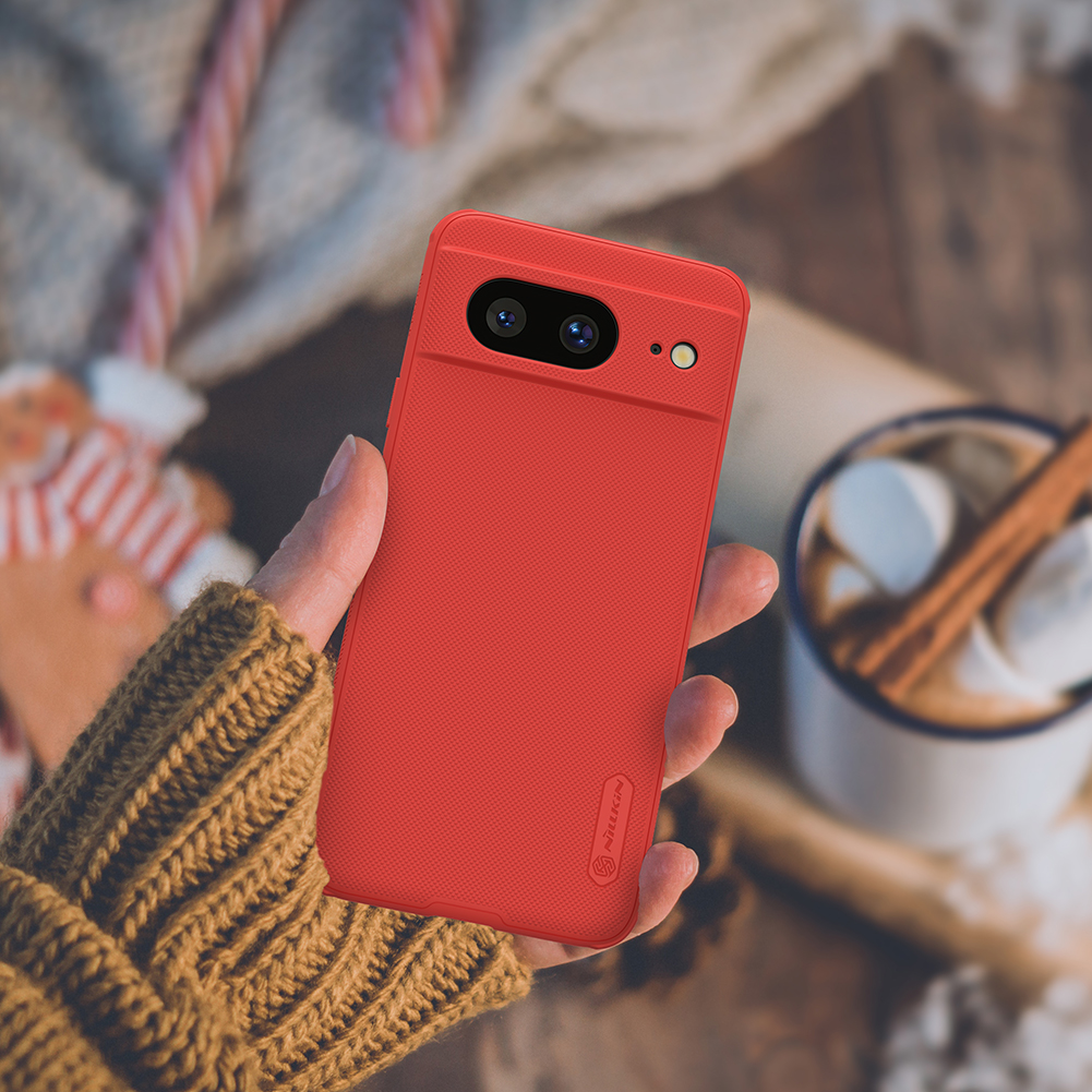 Защитный чехол красного цвета от Nillkin серии Super Frosted Shield Pro для смартфона Google Pixel 8 с усиленными боковыми рамками по четырем углам, изготавливается из экологичных материалов PC и TPU путем высокоточного литья под давление с высокой температурой.