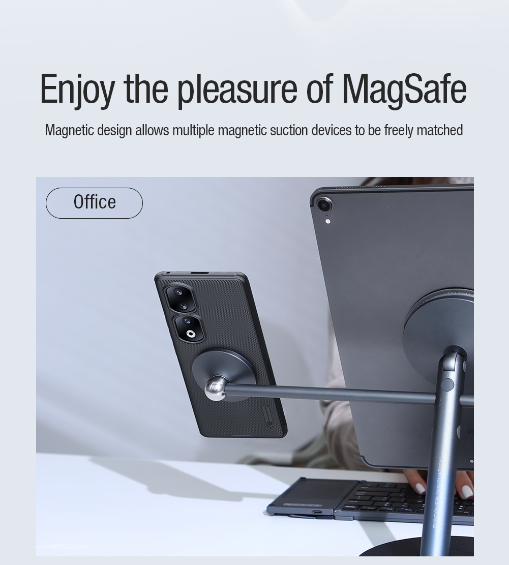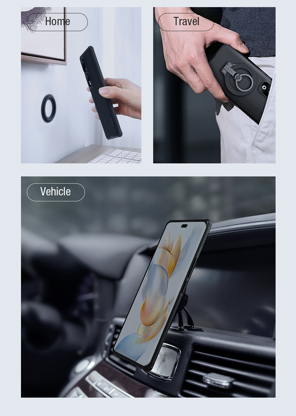 Защитный чехол черного цвета от Nillkin серии Super Frosted Shield Pro Magnetic для смартфона Huawei Honor 90 Pro с усиленными боковыми рамками по четырем углам и встроенным магнитом, изготавливается из экологичных материалов PC и TPU путем высокоточного литья под давление с высокой температурой.