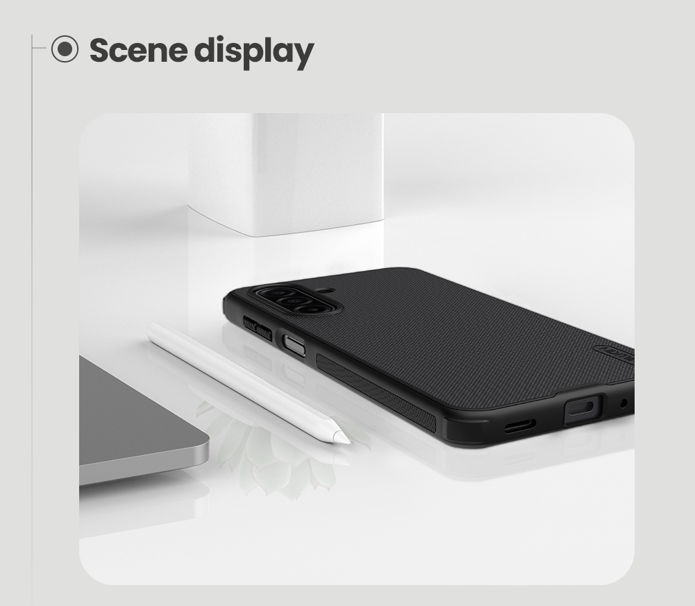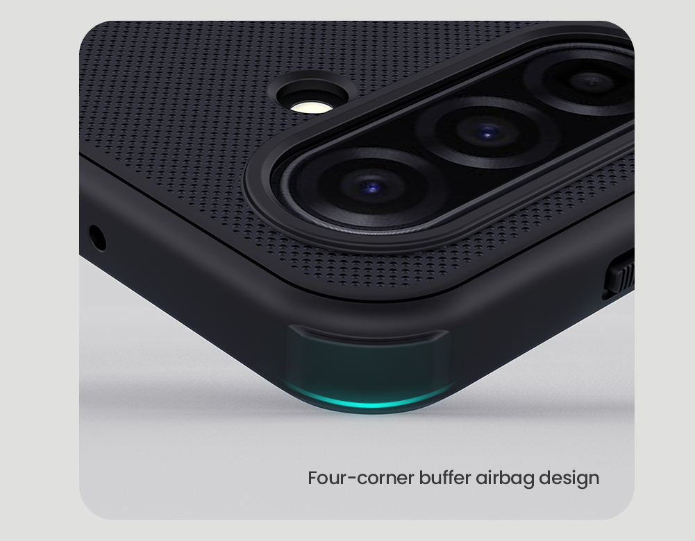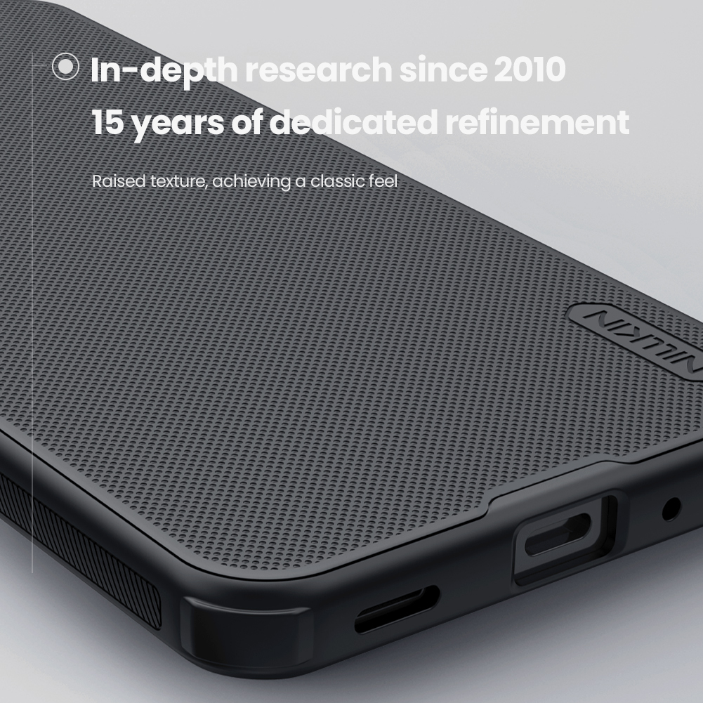 Защитный чехол черного цвета от Nillkin серии Super Frosted Shield Pro Magnetic для смартфона Samsung Galaxy A17 5G с усиленными боковыми рамками по четырем углам и встроенным магнитом, изготавливается из экологичных материалов PC и TPU путем высокоточного литья под давление с высокой температурой.