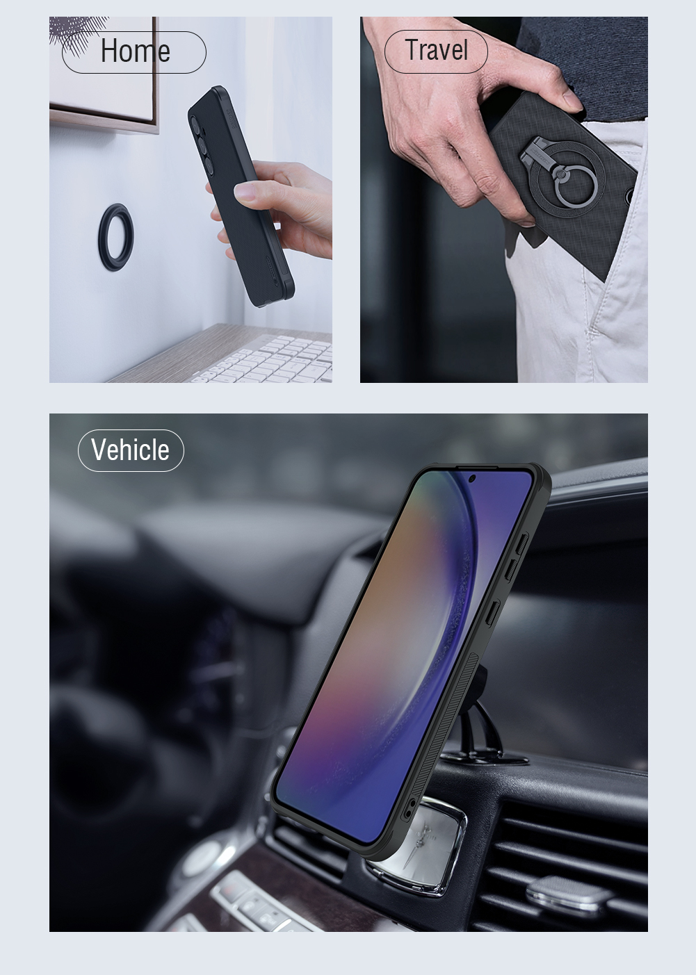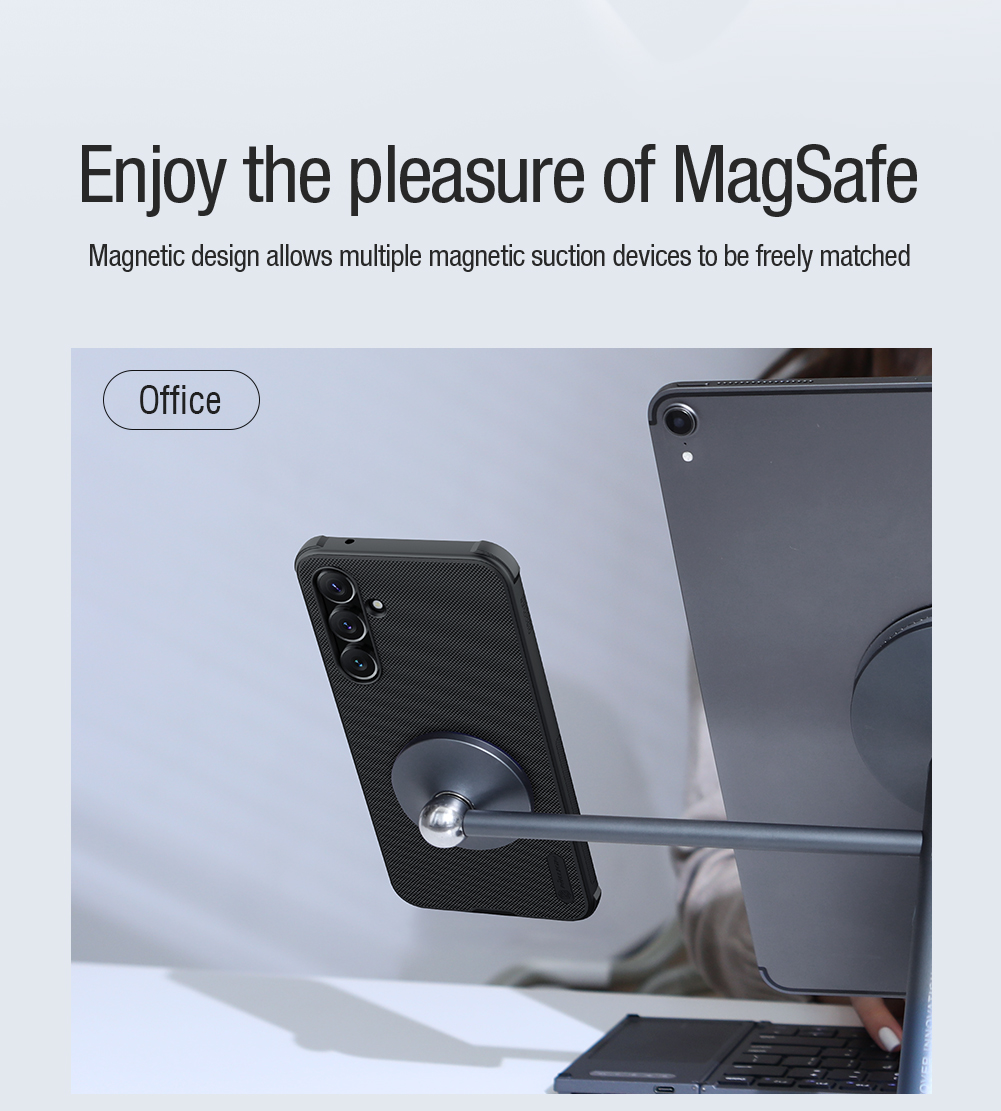 Защитный чехол черного цвета от Nillkin серии Super Frosted Shield Pro Magnetic для смартфона Samsung Galaxy A55 с усиленными боковыми рамками по четырем углам и встроенным магнитом, изготавливается из экологичных материалов PC и TPU путем высокоточного литья под давление с высокой температурой.