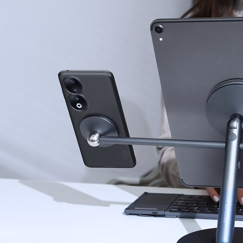 Защитный чехол черного цвета от Nillkin серии Super Frosted Shield Pro Magnetic для смартфона Honor 90 с усиленными боковыми рамками по четырем углам и встроенным магнитом, изготавливается из экологичных материалов PC и TPU путем высокоточного литья под давление с высокой температурой.