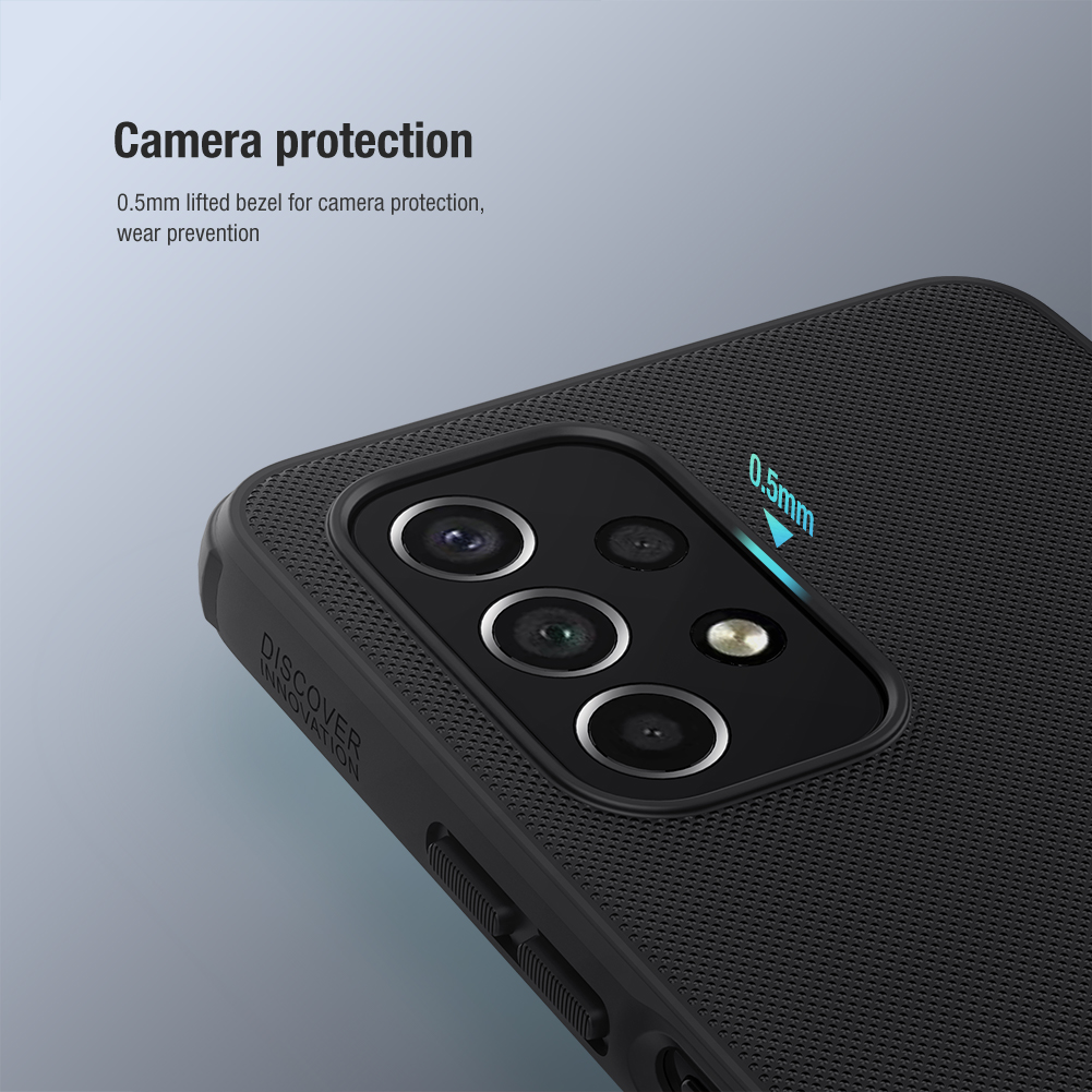 Тонкий защитный чехол черного цвета от Nillkin серии Super Frosted Shield для смартфона Samsung Galaxy A53 5G с усиленными боковыми рамками по четырем углам, изготавливается из экологичных материалов PC и TPU путем высокоточного литья под давление с высокой температурой.