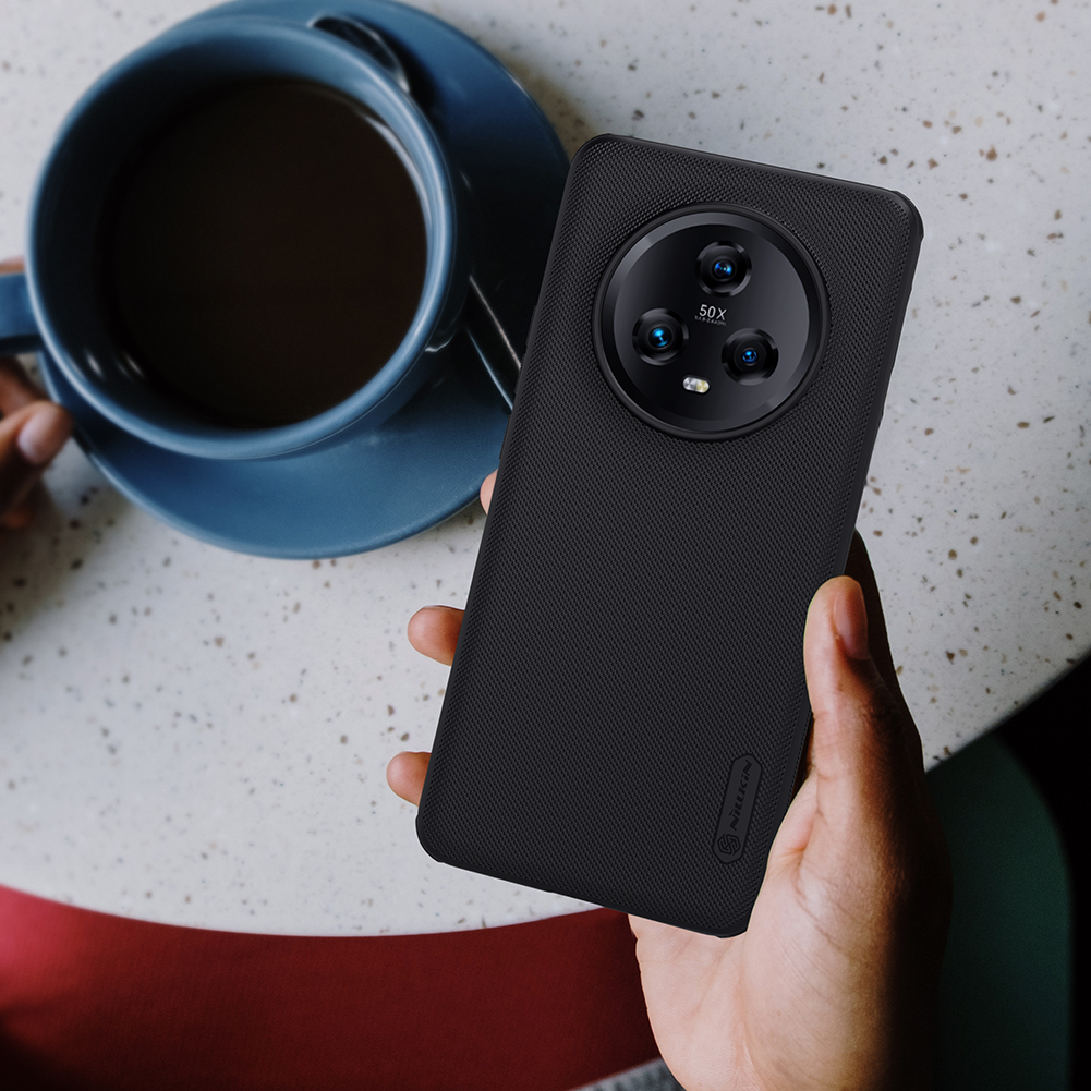 Защитный чехол черного цвета от Nillkin серии Super Frosted Shield для смартфона Honor Magic 5 с усиленными боковыми рамками по четырем углам, изготавливается из экологичных материалов PC и TPU путем высокоточного литья под давление с высокой температурой.