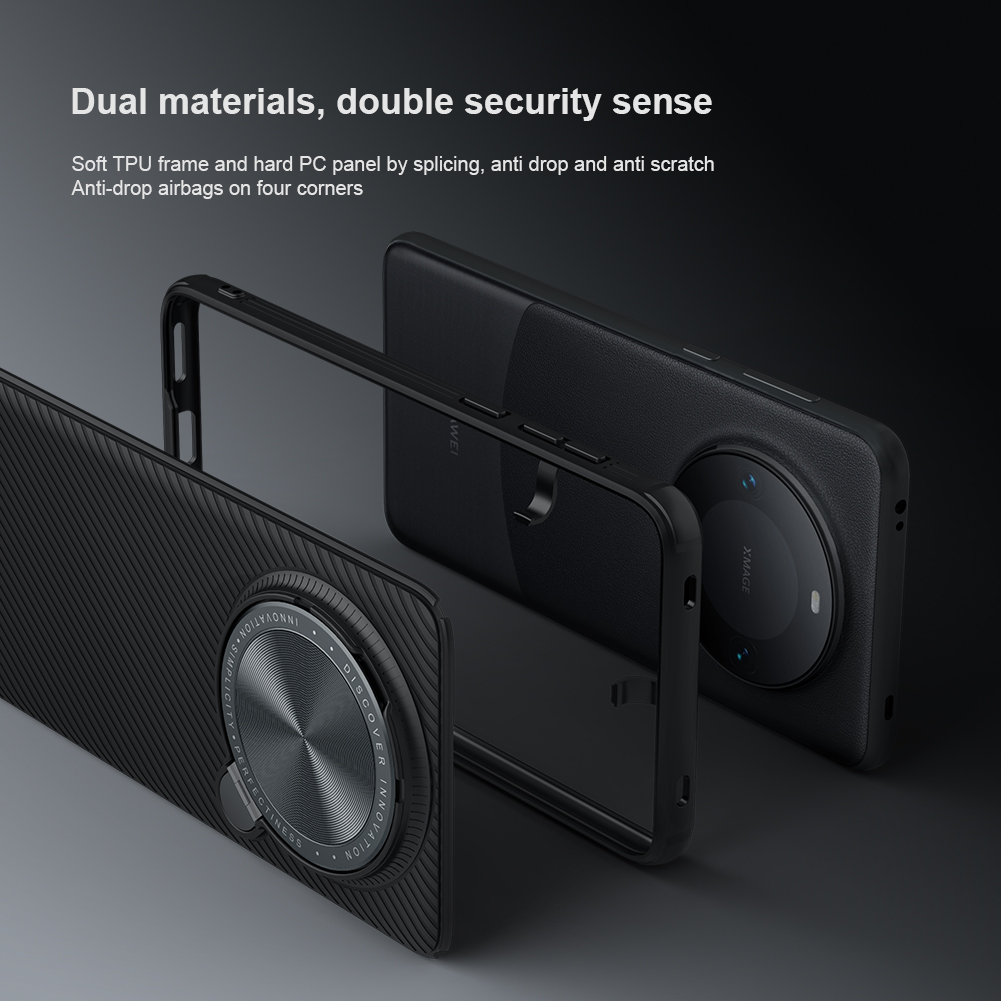 Противоударный чехол черного цвета с откидной металлической защитной крышкой для камеры от Nillkin серии CamShield Prop Case для телефона Huawei Mate 60 Pro и 60 Pro+ создан для любителей активного отдыха.