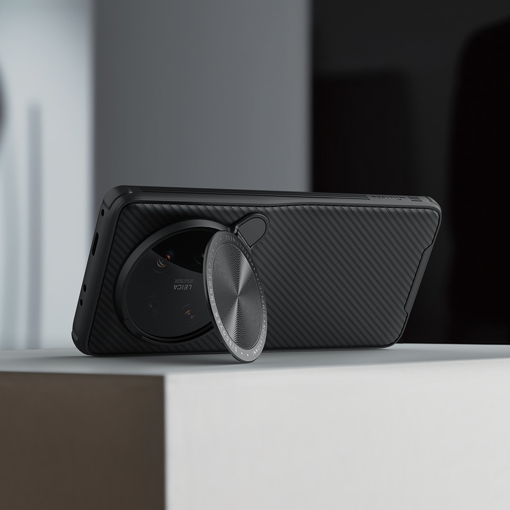 Противоударный чехол черного цвета с откидной металлической защитной крышкой для камеры от Nillkin серии CamShield Prop Case для телефона Xiaomi 13 Ultra создан для любителей активного отдыха.