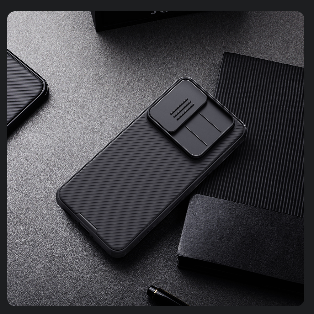 Противоударный чехол черного цвета с защитной шторкой задней камеры от Nillkin серии CamShield Pro Case для телефона Samsung Galaxy A56 5G создан для любителей активного отдыха.