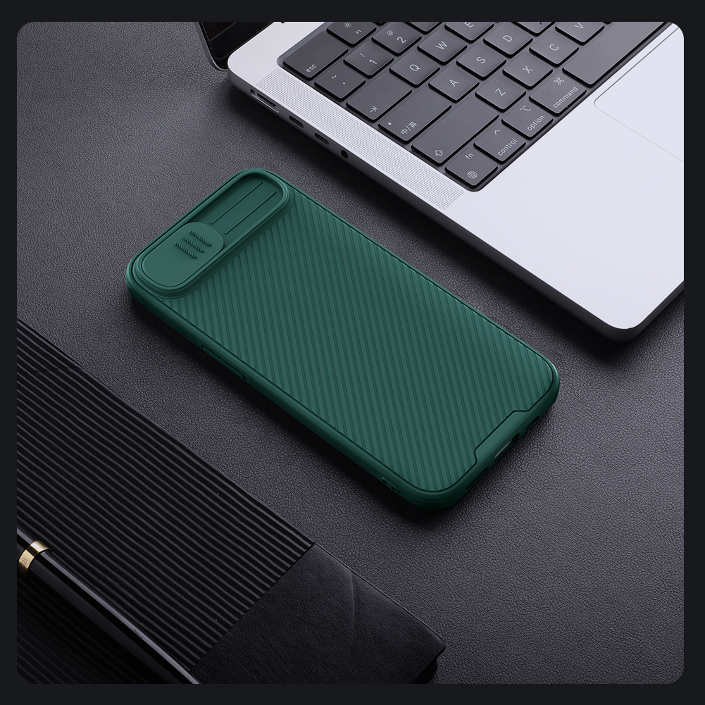 Противоударный чехол зеленого цвета (Dark Green) с защитной шторкой задней камеры от Nillkin серии CamShield Pro Case для телефона iPhone 16e создан для любителей активного отдыха.