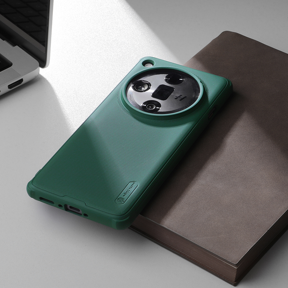 Защитный чехол зеленого цвета (Deep Green) от Nillkin серии Super Frosted Shield для смартфона OPPO Find X7 Ultra с усиленными боковыми рамками по четырем углам, изготавливается из экологичных материалов PC и TPU путем высокоточного литья под давление с высокой температурой.