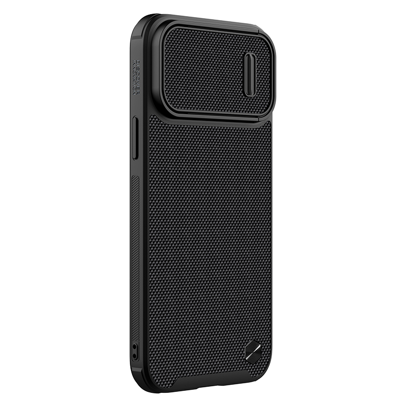 Противоударный чехол черного цвета с полуавтоматической защитной шторкой задней камеры от Nillkin серии Textured Case S для телефона iPhone 13 Pro Max создан для любителей активного отдыха.