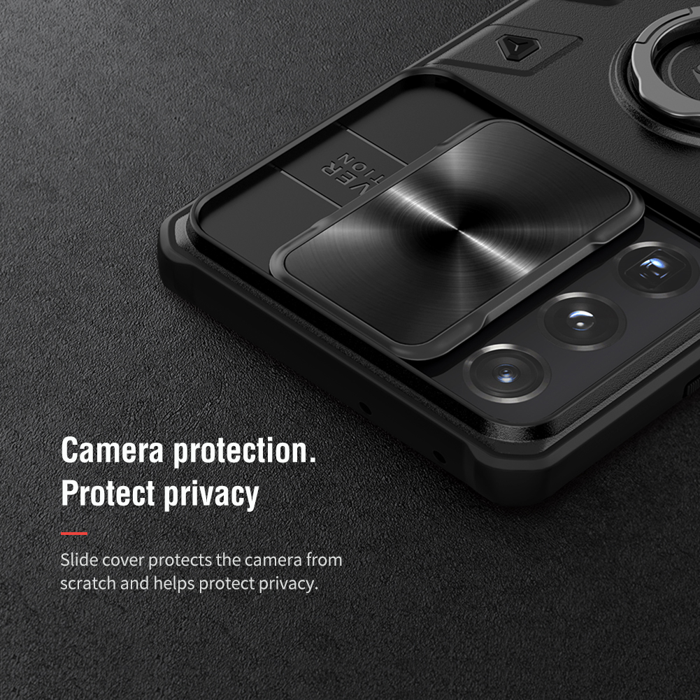 Противоударный чехол черного цвета с кольцом и металлической защитной крышкой для задней камеры от Nillkin серии CamShield Armor Case для смартфона Samsung Galaxy S21 Ultra создан для любителей активного отдыха.