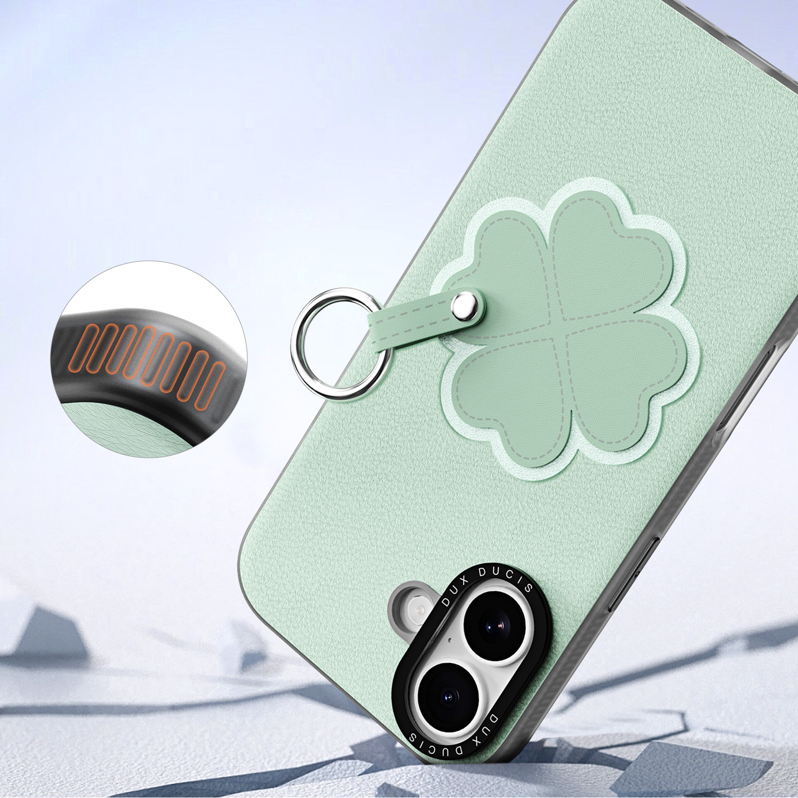 Чехол из искусственной кожи зеленого цвета (Clover Edition) серии Luvy для iPhone 17. Встроенное вращающееся кольцо - надёжный захват одной рукой, предотвращающий падение; в комплект входит ремешок с защитой от потери.