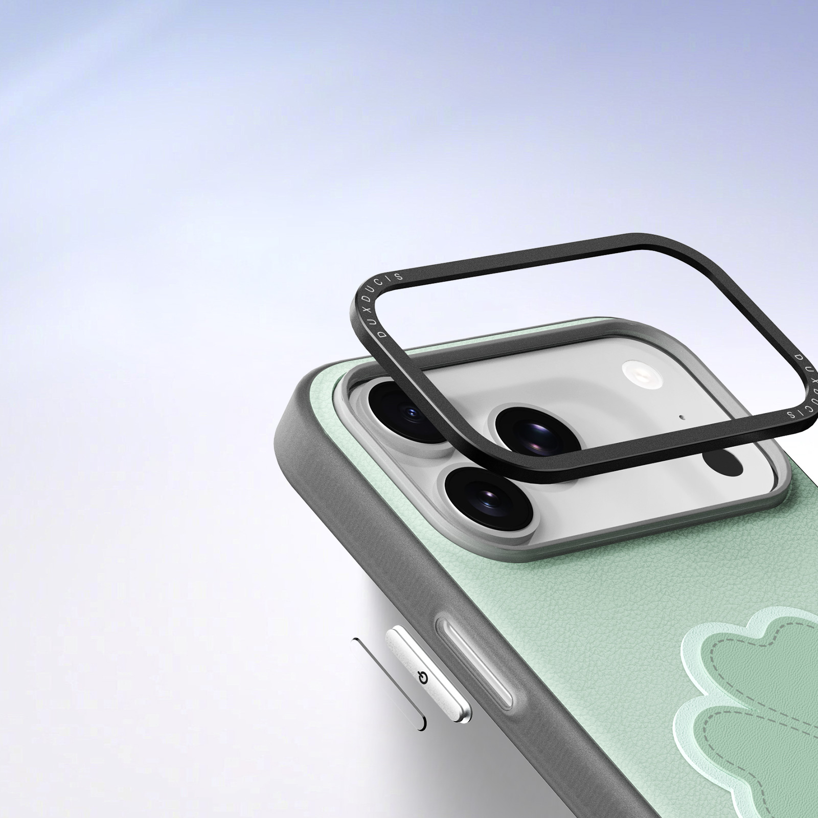 Чехол из искусственной кожи зеленого цвета (Clover Edition) серии Luvy для iPhone 17 Pro. Встроенное вращающееся кольцо - надёжный захват одной рукой, предотвращающий падение; в комплект входит ремешок с защитой от потери.