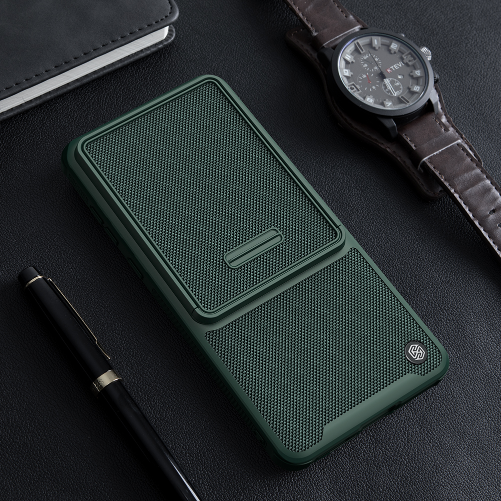 Противоударный чехол темно-зеленого цвета (Dark Green) с полуавтоматической защитной шторкой задней камеры от Nillkin серии Textured Case S для телефона Huawei Mate 50 pro создан для любителей активного отдыха.