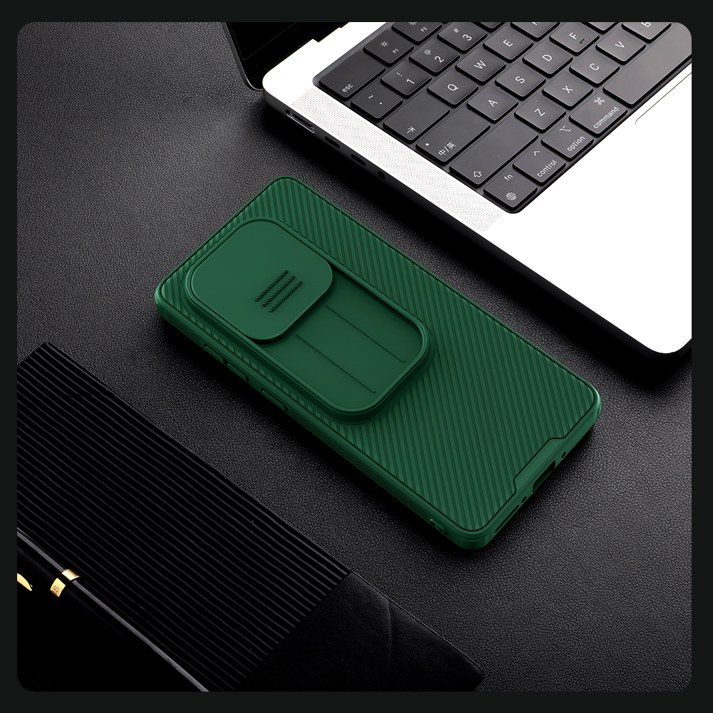 Противоударный чехол зеленого цвета (Dark Green) с защитной шторкой задней камеры от Nillkin серии CamShield Pro Case для телефона OnePlus 13R, OnePlus Ace 5 и 5 Pro создан для любителей активного отдыха.