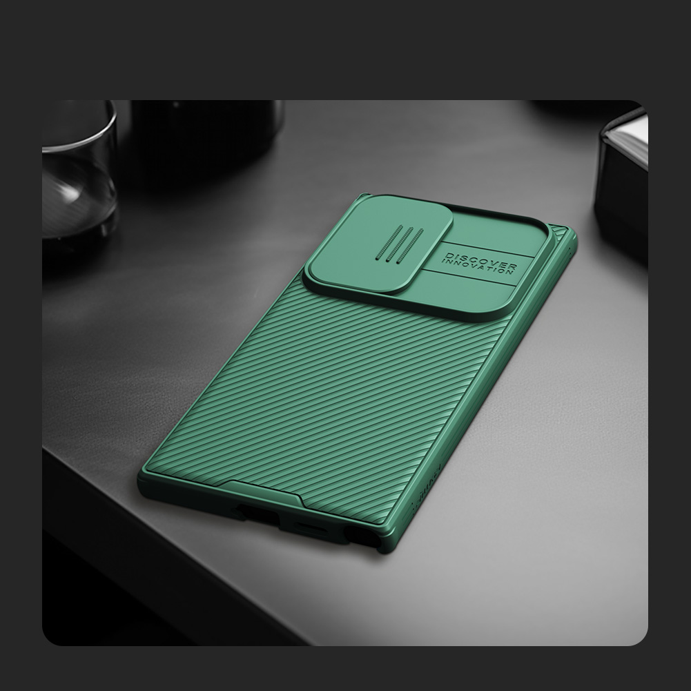 Противоударный чехол зеленого цвета (Deep Green) с защитной крышкой для задней камеры и беспроводной зарядкой MagSafe от Nillkin серии CamShield Pro Magnetic Case для смартфона Samsung Galaxy S24 Ultra.