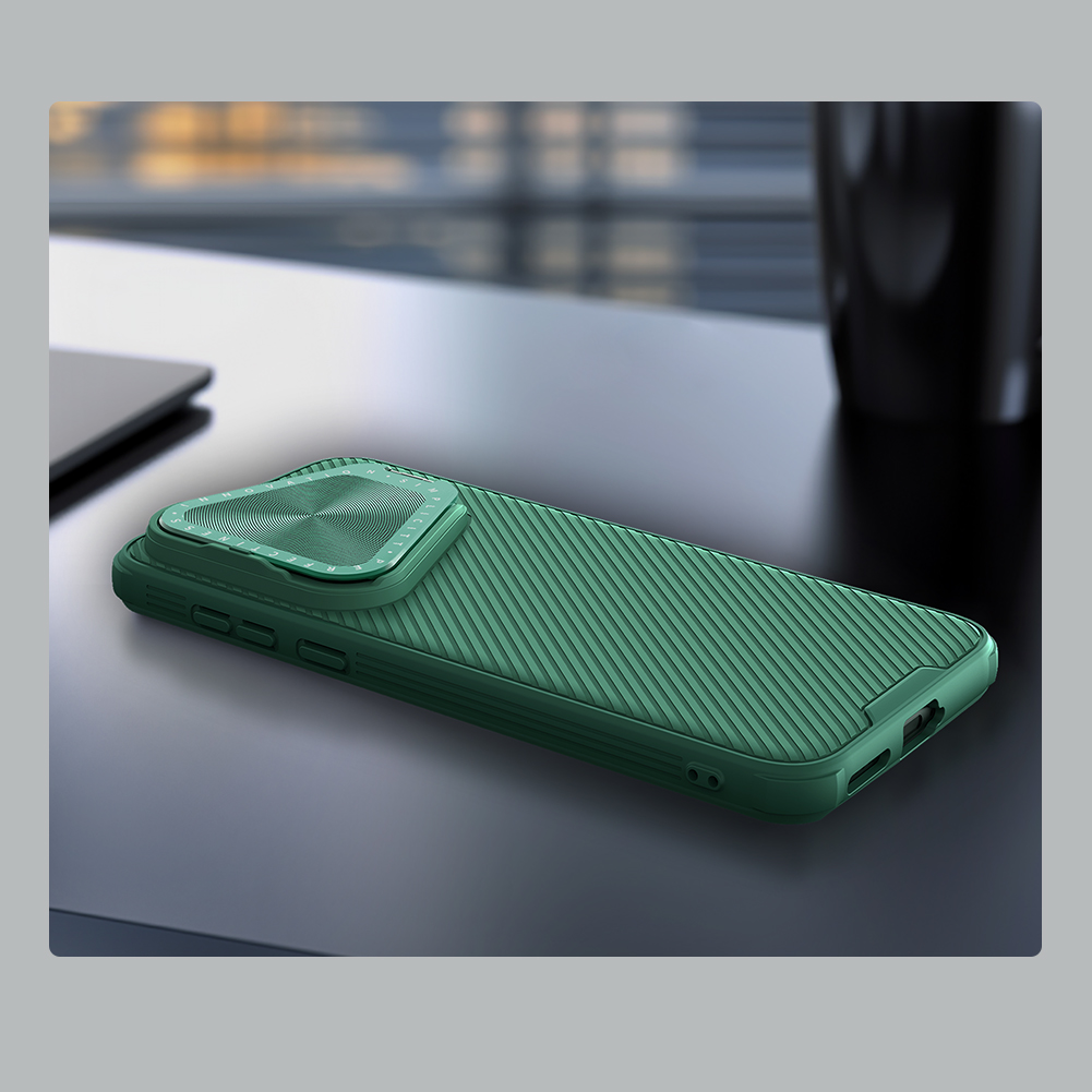 Противоударный чехол зеленого цвета (Deep Green) с откидной металлической защитной крышкой для камеры от Nillkin серии CamShield Prop Case для телефона Huawei Pura 70 создан для любителей активного отдыха.