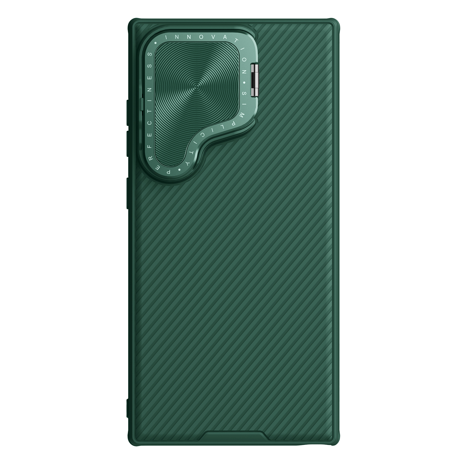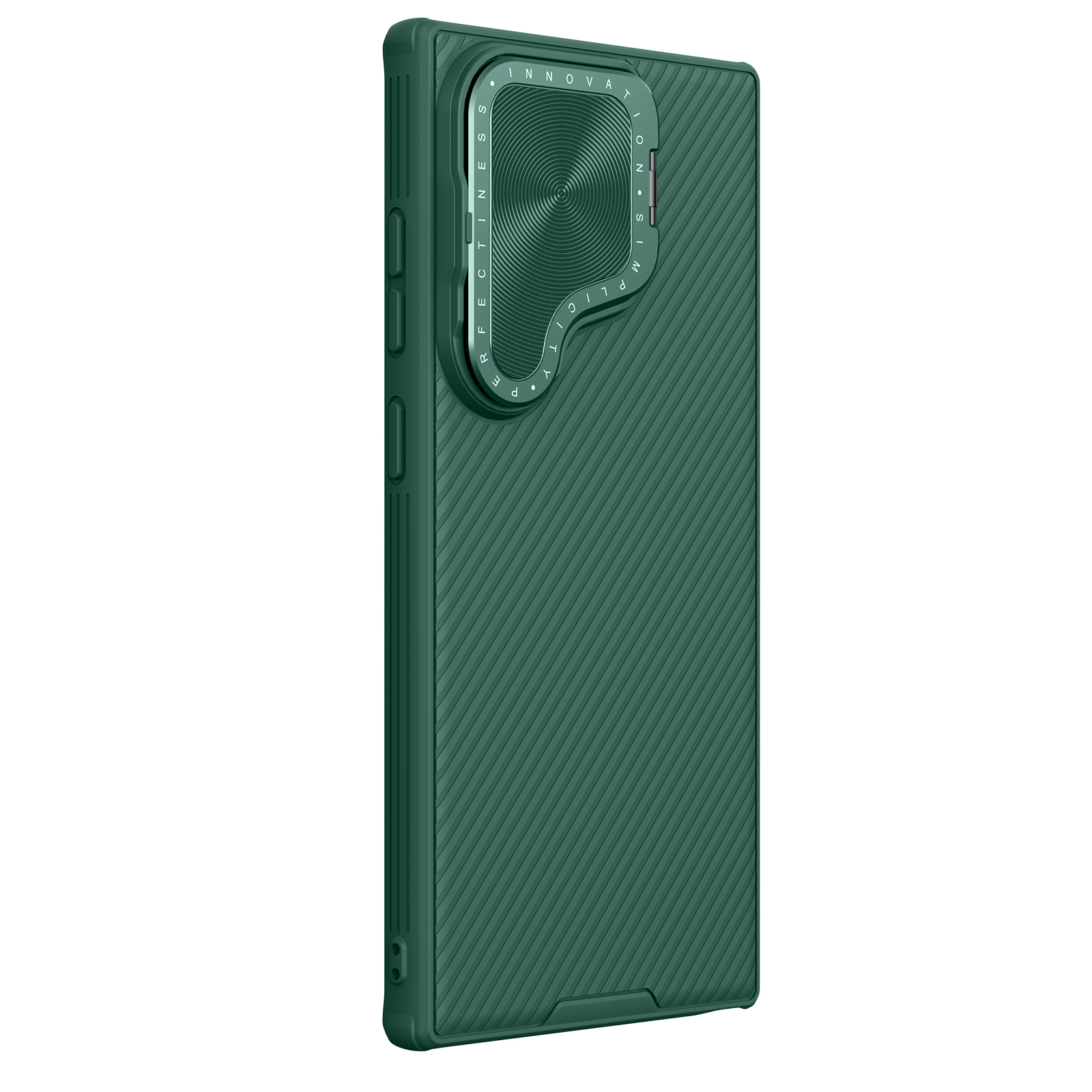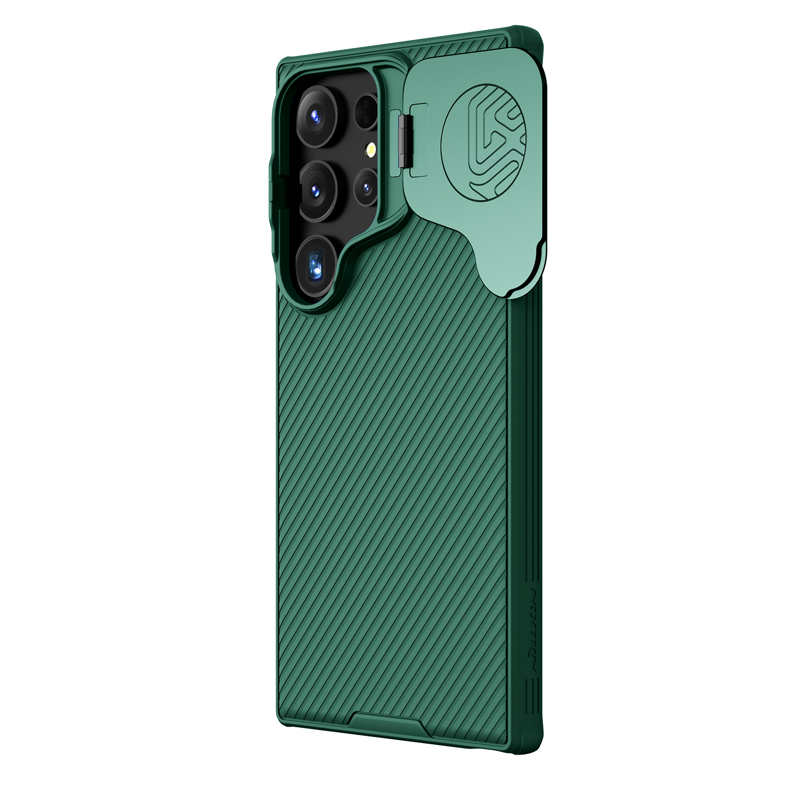 Противоударный чехол зеленого цвета (Deep Green) с откидной металлической защитной крышкой для камеры от Nillkin серии CamShield Prop Case для телефона Samsung Galaxy S24 Ultra создан для любителей активного отдыха.