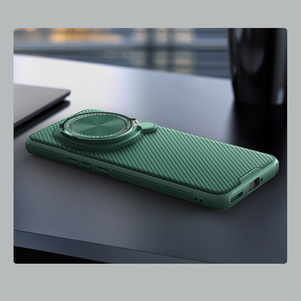 Противоударный чехол зеленого цвета (Deep Green) с откидной металлической защитной крышкой для камеры от Nillkin серии CamShield Prop Case для телефона Huawei Honor Magic 6 Pro создан для любителей активного отдыха.