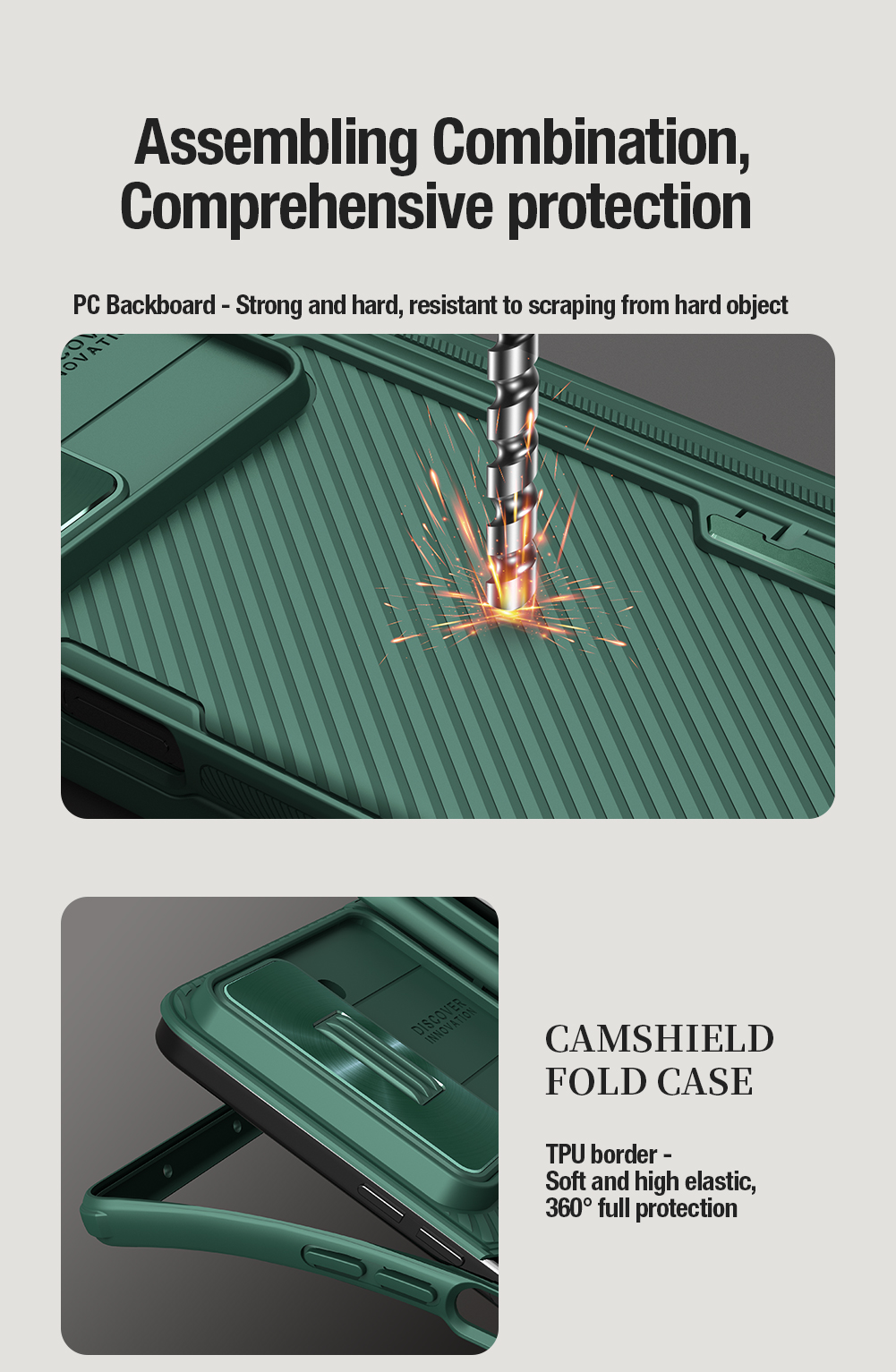 Противоударный чехол зеленого цвета (Deep Green) с защитной шторкой задней камеры от Nillkin серии CamShield Pro Case для телефона Samsung Galaxy Z Fold 5 создан для любителей активного отдыха.