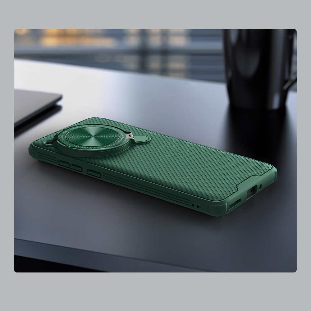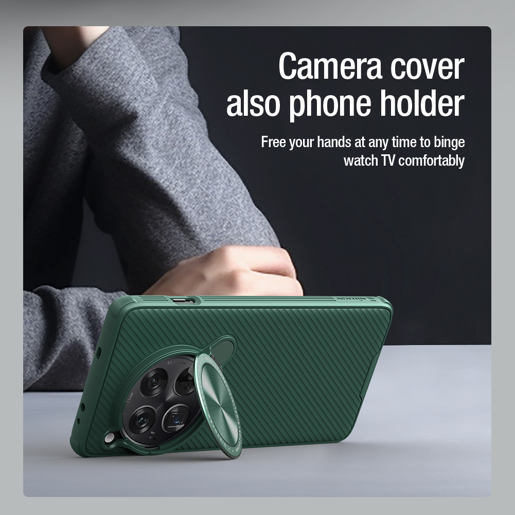 Противоударный чехол зеленого цвета (Deep Green) с откидной металлической защитной крышкой для камеры от Nillkin серии CamShield Prop Case для телефона OnePlus 12 создан для любителей активного отдыха.