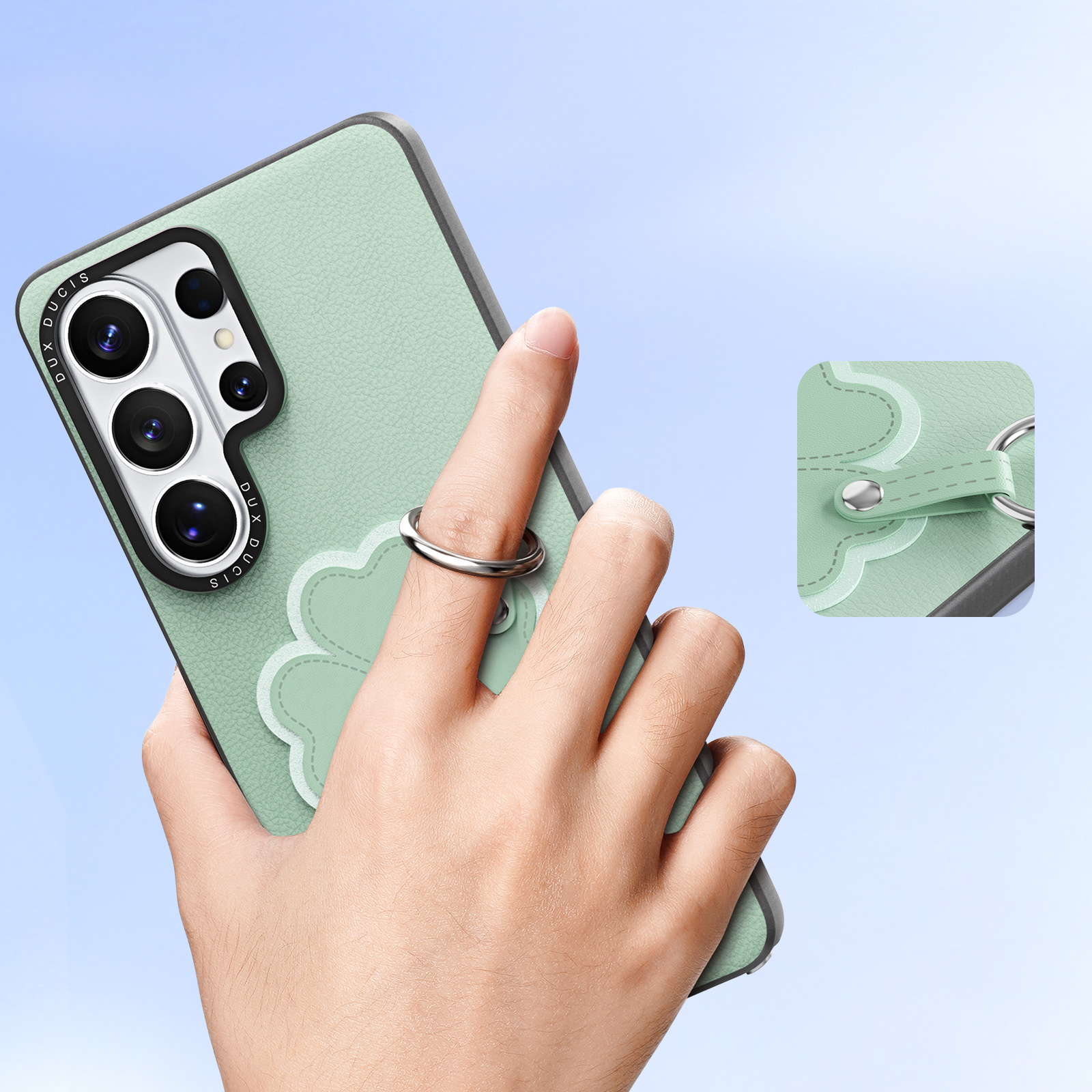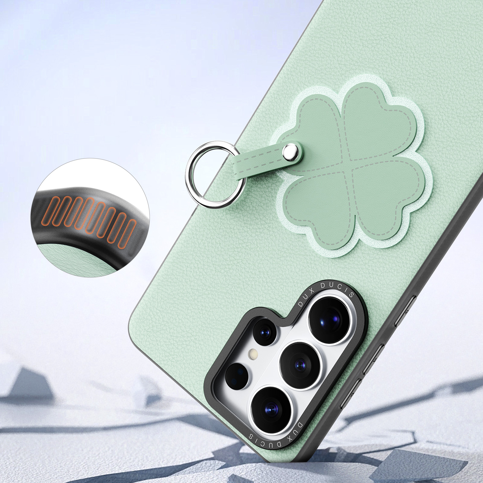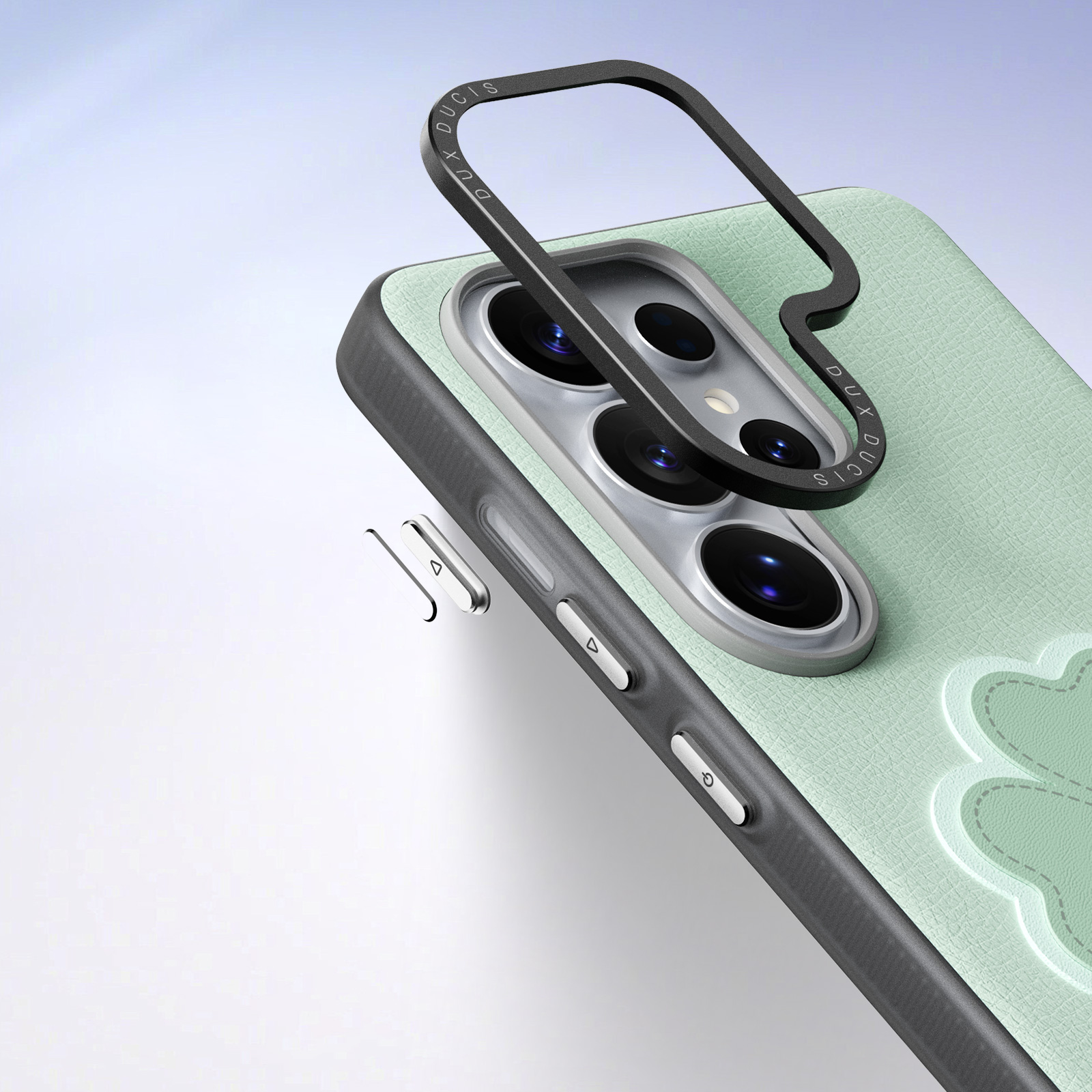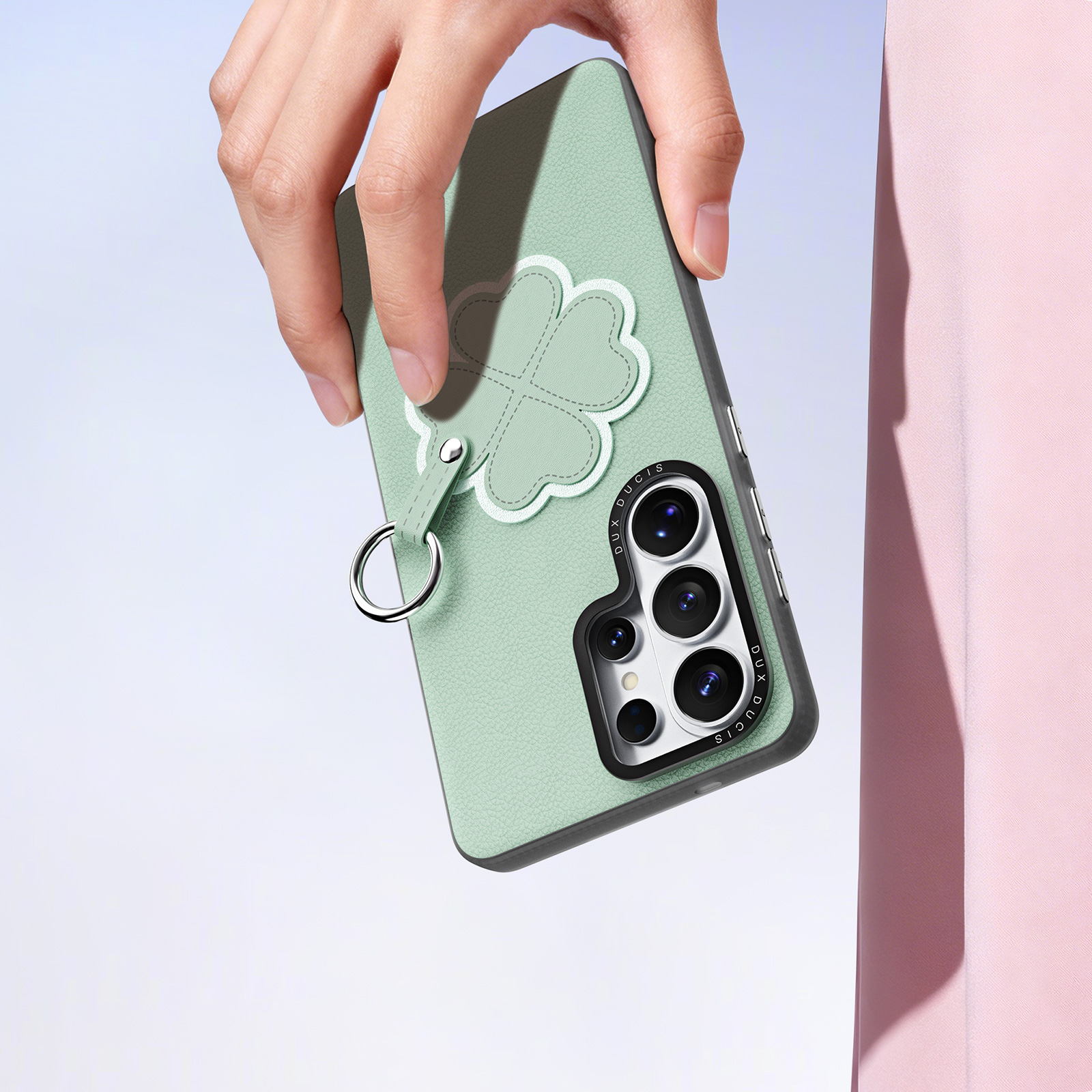 Зелёный чехол для смартфона Samsung Galaxy S26 Ultra, серия Luvy Series Case от бренда Dux Ducis - это стильный аксессуар свежего мятного оттенка, наполненный лёгкостью и весенним настроением. Мягкая матовая текстура чехла создаёт приятные тактильные ощущения и эффективно предотвращает появление потёртостей и царапин на корпусе устройства. Центральный декоративный элемент в виде четырёхлистного клевера с тонкой контурной строчкой символизирует удачу и гармонию, подчёркивая индивидуальность владельца. Удобный съёмный ремешок позволяет носить телефон на запястье или прикрепить к сумке, обеспечивая максимальную мобильность и комфорт. Чехол аккуратно огибает форму смартфона, оставляя открытым модуль камеры и все важные разъёмы, не затрудняя управление устройством. Это идеальный выбор для тех, кто ценит природные оттенки, позитивные образы и практичное оформление своего мобильного устройства.