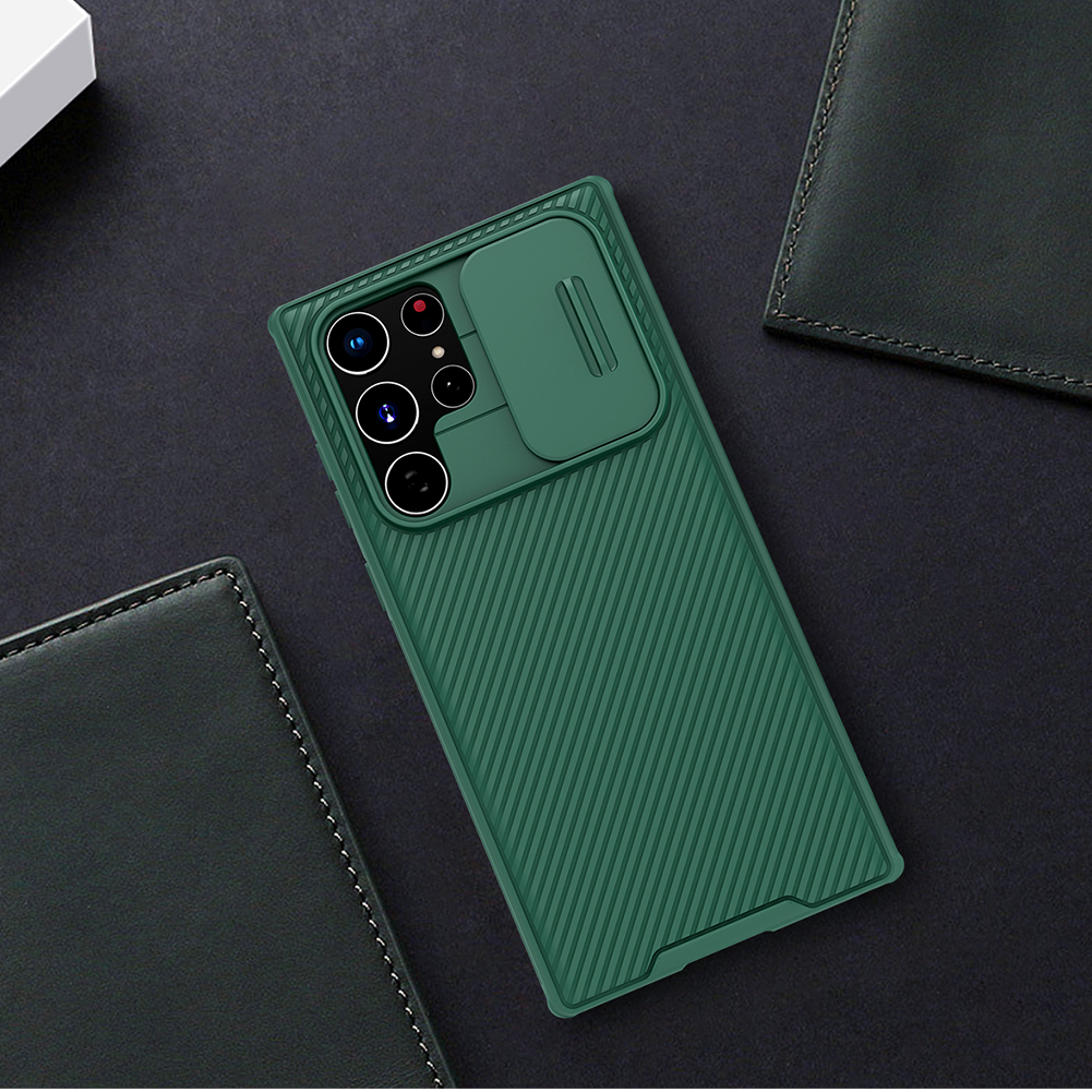 Противоударный чехол зеленого цвета с защитной шторкой задней камеры от Nillkin серии CamShield Pro Case для телефона Samsung Galaxy S22 Ultra создан для любителей активного отдыха.