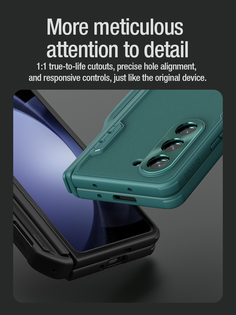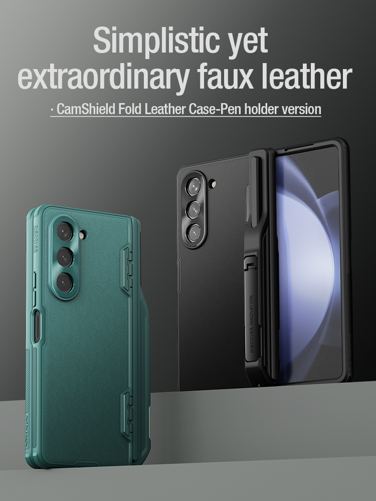 Противоударный чехол темно-зеленого цвета (Light Green) от Nillkin серии CamShield Fold Leather (в комплекте со съемным держателем для S Pen) и металлической рамкой для линз на смартфон Samsung Galaxy Z Fold 5 создан для любителей активного отдыха.